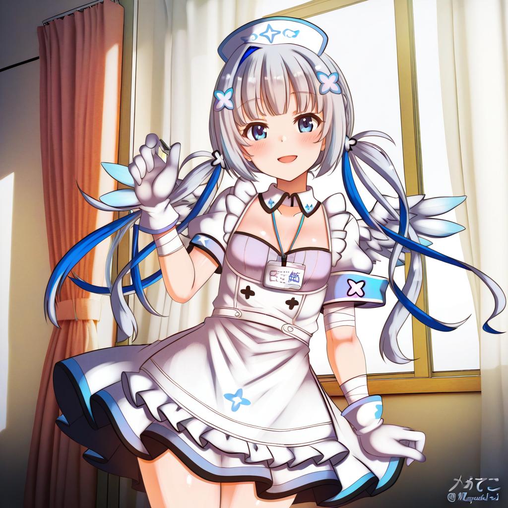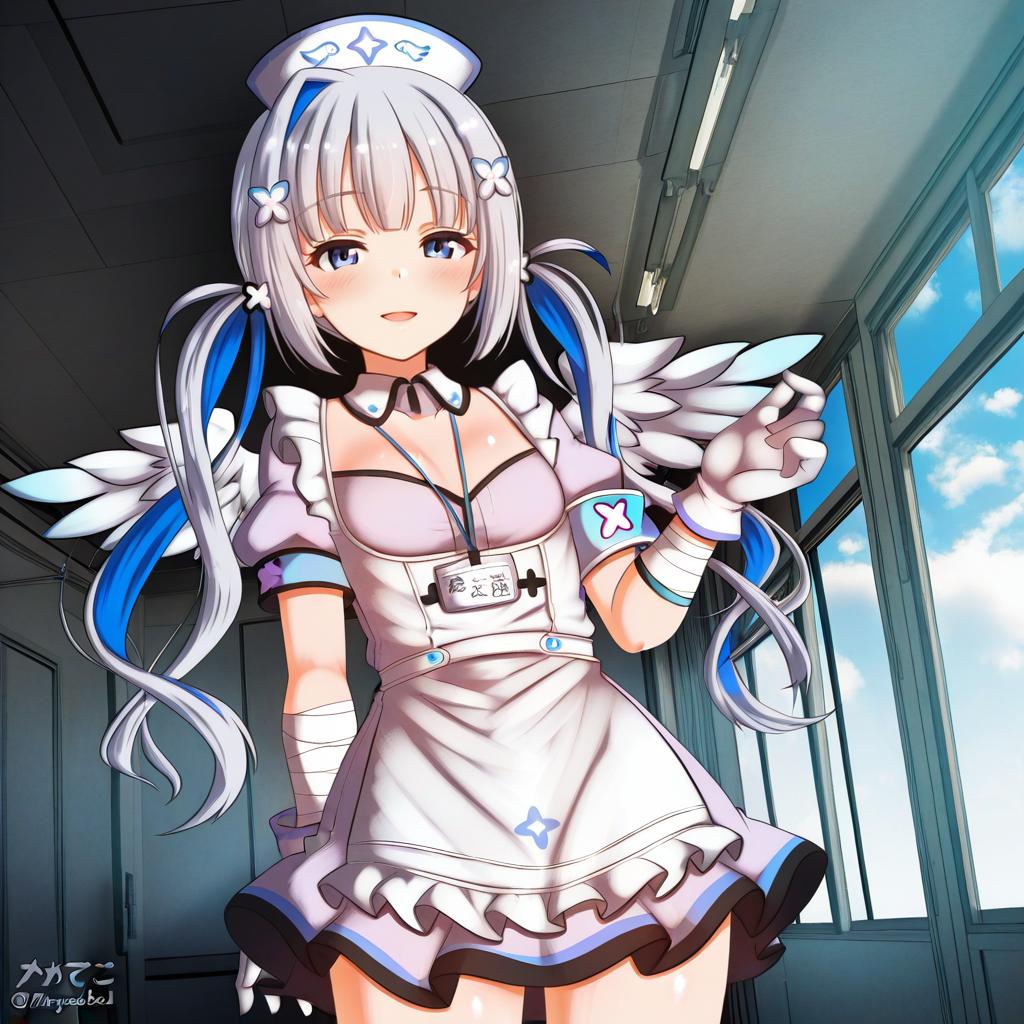 Amane kanata (nurse), hololive, 1girl, angel wings, angel wings, purple eyes, blue hair, grey hair, colored inner hair, single hair intake, official alternate hairstyle, streaked hair, official alternate hair length, long hair, pink hair, x hair ornament, twintails, blunt bangs, small breasts, flat chest, nurse cap, white gloves, white dress, white apron, detached collar, puffy short sleeves, virtual youtuber, virtual youtuber, feathered wings, feathered wings, nurse, nurse, bandaged arm, id card, armband, by artist megadeko, illustrious
