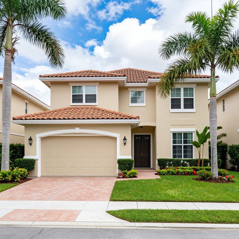 Sunny two-story home at 6911 Royal Orchid Circle, Delray Beach, FL 33446, featuring a beige exterior, arched garage door, double front doors, and lush landscaping including palm trees and manicured hedges under a partly cloudy sky.
