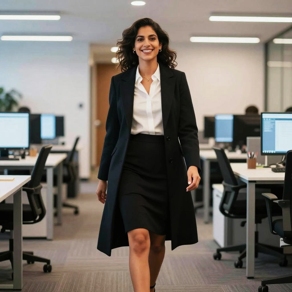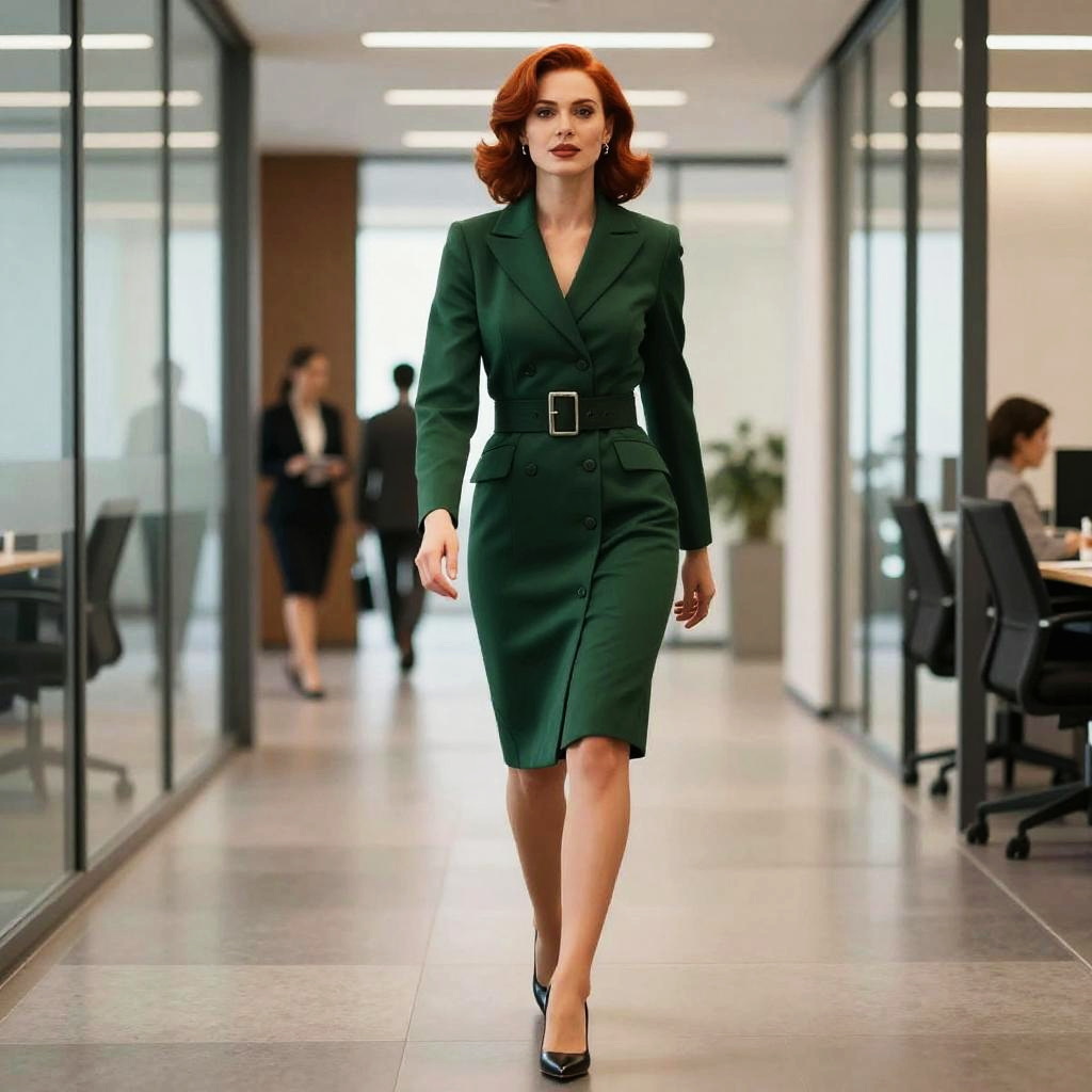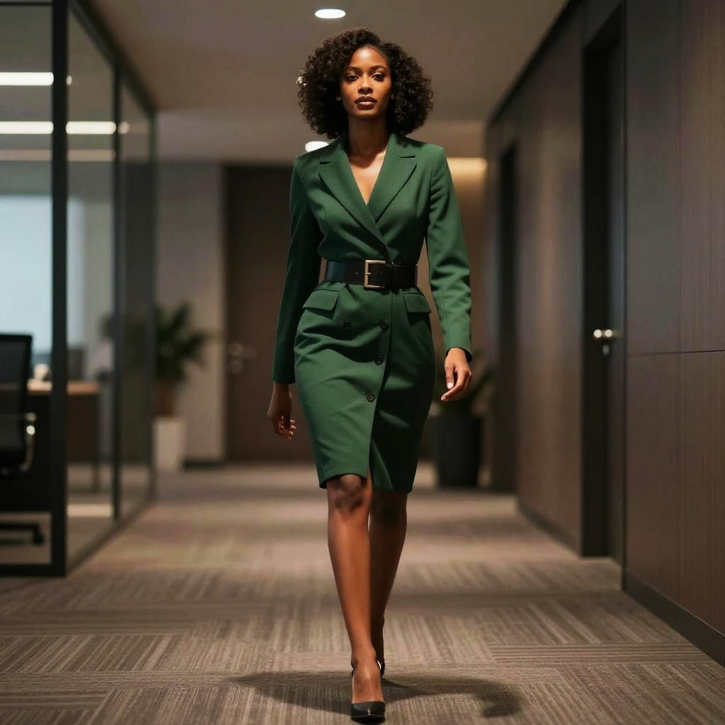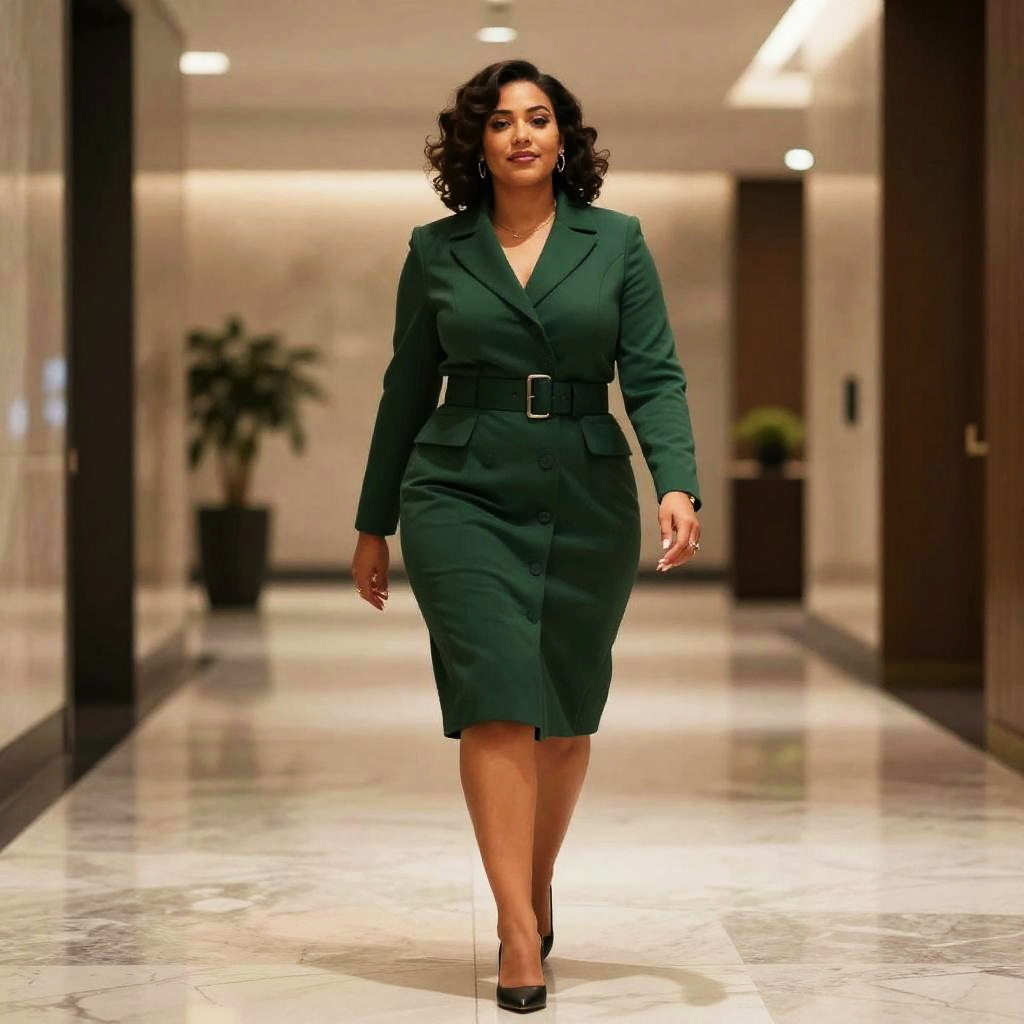 Office lady, Latina woman with loose waves and confident, warm smile in forest green tailored coatdress with wide belt and stiletto heels, walking confidently down a corporate hallway in boardroom corridor with glass doors and abstract art on the walls, strong leadership vibe, dramatic lighting, high-resolution lifestyle photo, shallow depth of field