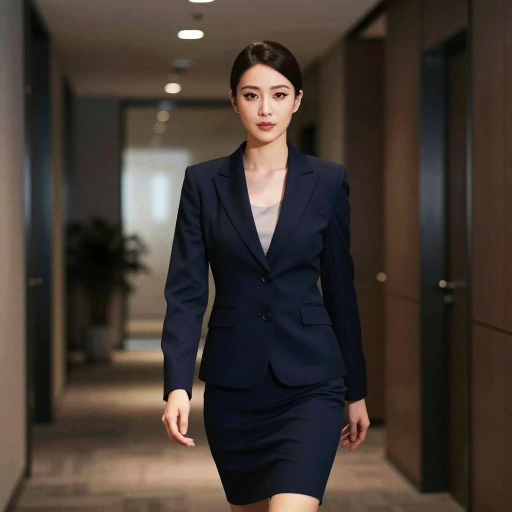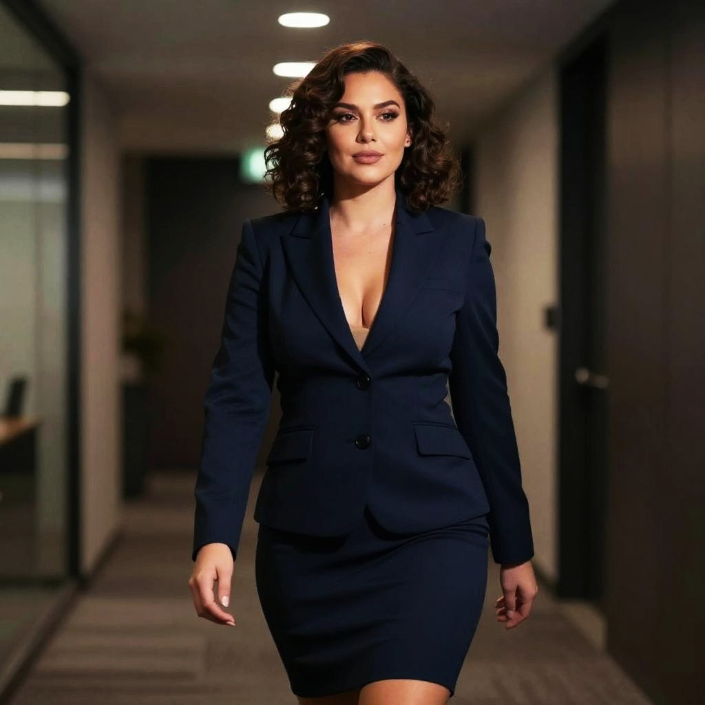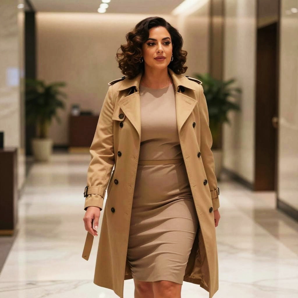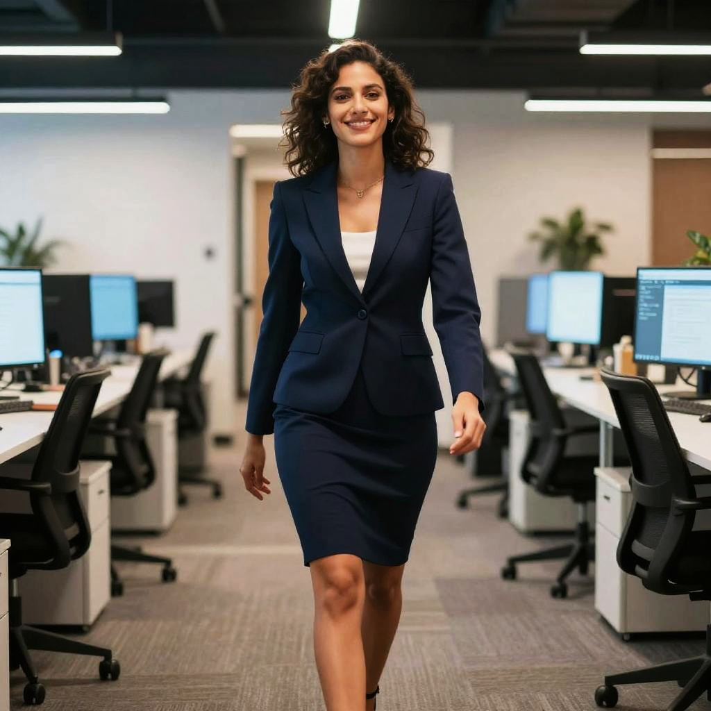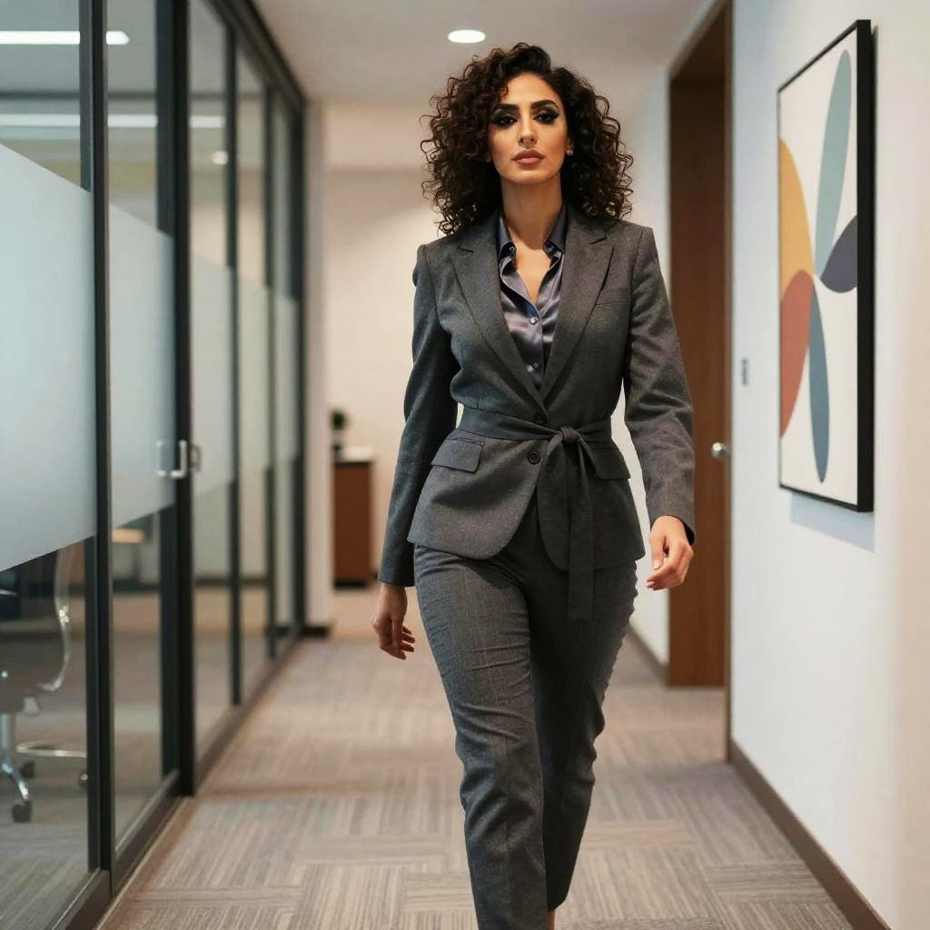 Office lady, Latina woman with loose waves and confident, warm smile in forest green tailored coatdress with wide belt and stiletto heels, walking confidently down a corporate hallway in boardroom corridor with glass doors and abstract art on the walls, strong leadership vibe, dramatic lighting, high-resolution lifestyle photo, shallow depth of field