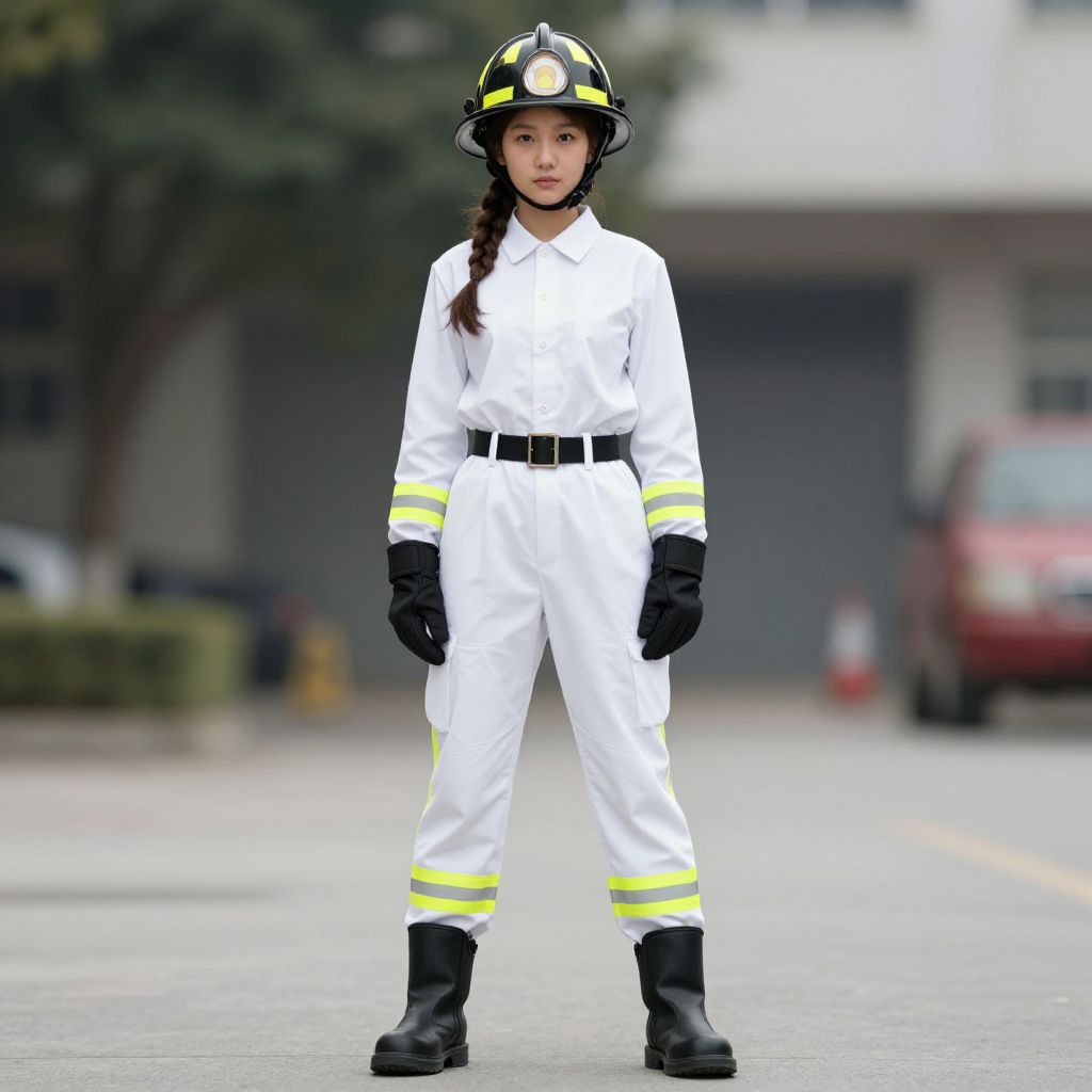 Photograph of an Asian woman in white firefighter uniform, black gloves, and helmet, standing on a suburban street, focused expression.