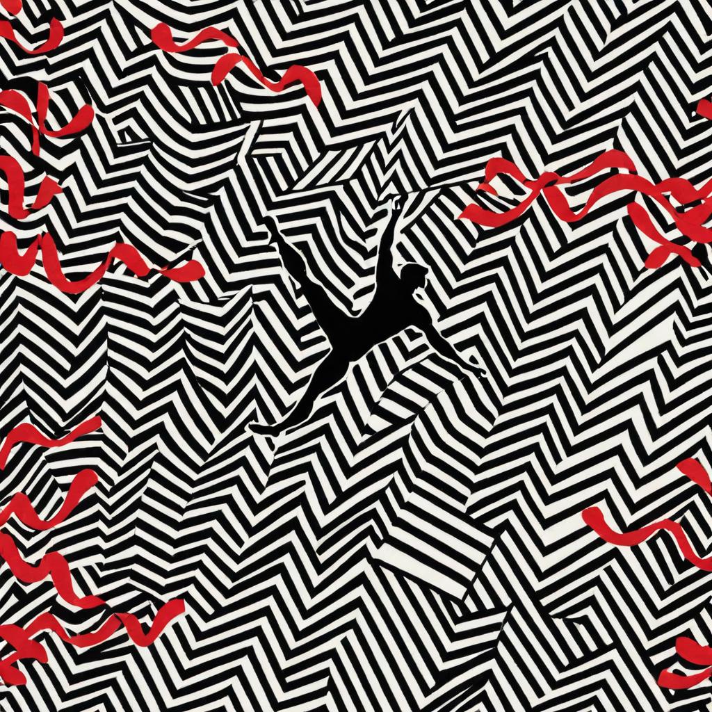 Dynamic acrobat, rendered in the style of Henri Matisse, with sinuous, flowing shapes and vibrant, flat planes of color. The background features geometric zigzag forms, using contrasting blacks, whites, and electric reds to convey movement and rhythm in a joyous, abstract composition.