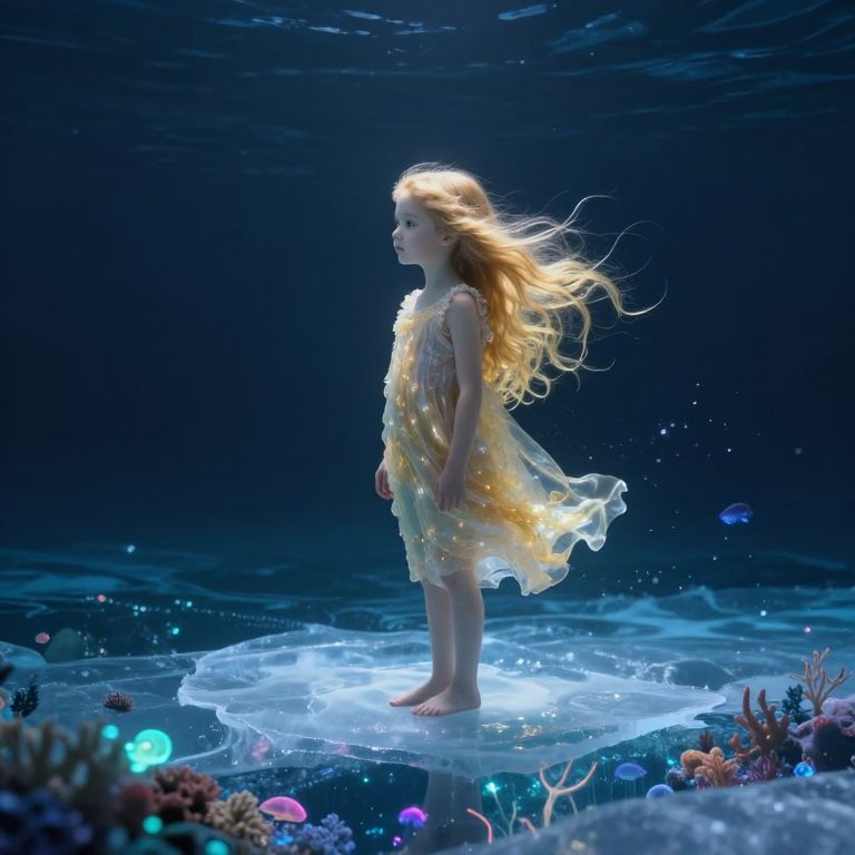 Digital artwork of a ethereal, white-clad woman dancing underwater in a dark, rocky cave. Her translucent dress flows gracefully, surrounded by floating bubbles. She stands in a shallow, glowing pool with light beams piercing through the water's surface. Her arms are outstretched, and her face is illuminated by the light. The background is dark, with jagged rock formations framing the scene. The overall mood is mystical and otherworldly, with a focus on light and movement.