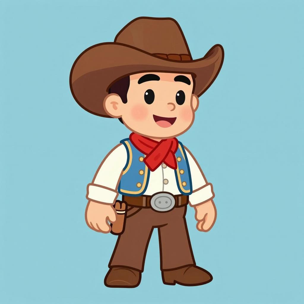 This illustration features a cheerful man wearing a cowboy hat and a classic Western outfit. The vibrant colors and playful character design create a lively and engaging atmosphere, perfect for a variety of creative projects.