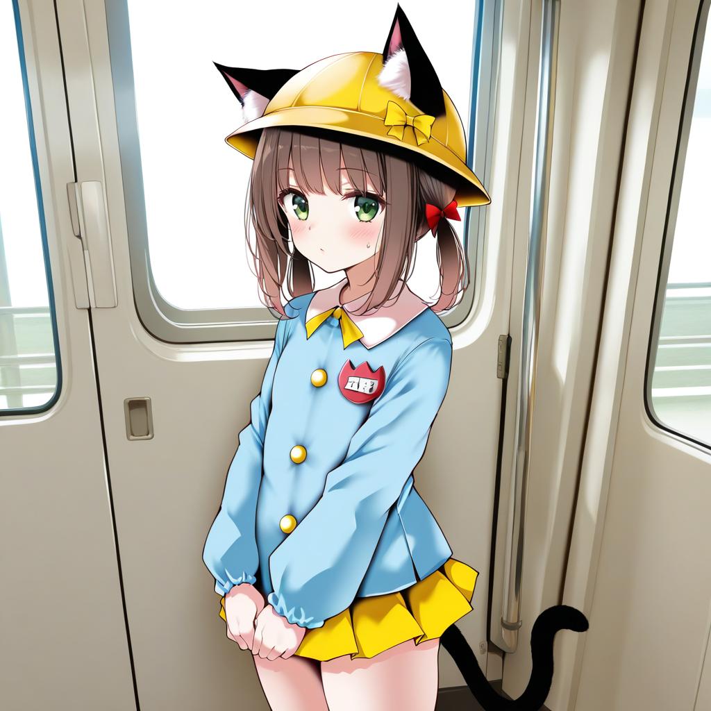 Digital anime-style drawing of a cute young girl with light brown hair, green eyes, and cat ears wearing a yellow construction helmet and a light blue, long-sleeved shirt with yellow buttons and a yellow skirt. The shirt has an "MIT" patch on the left side. She has a small, black cat tail and is standing inside a train car with large windows. The background shows metallic train walls and a door. Her expression is shy, with a slight blush on her cheeks. The lighting is bright, highlighting the clean, modern interior of the train.