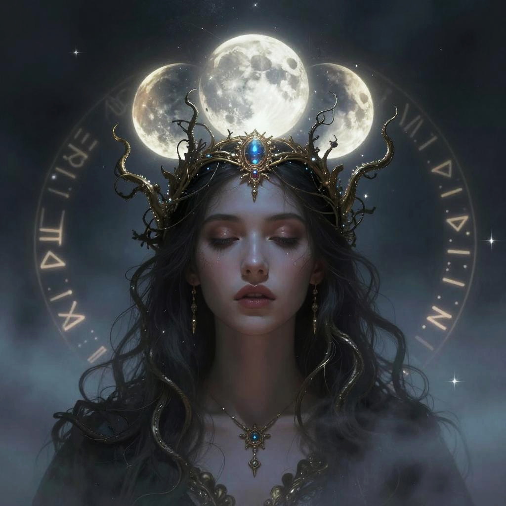 Ornate Hecate crown featuring triple moons and twisted vines, shimmering with magical energy atop a sorceress’s head, surrounded by fog and glowing runes, fantasy illustration.