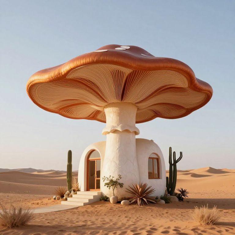 Alphonse Mucha dynamic flower shaped holiday house growing out of the ground like a mushroom in the desert designed by zaha hadid,