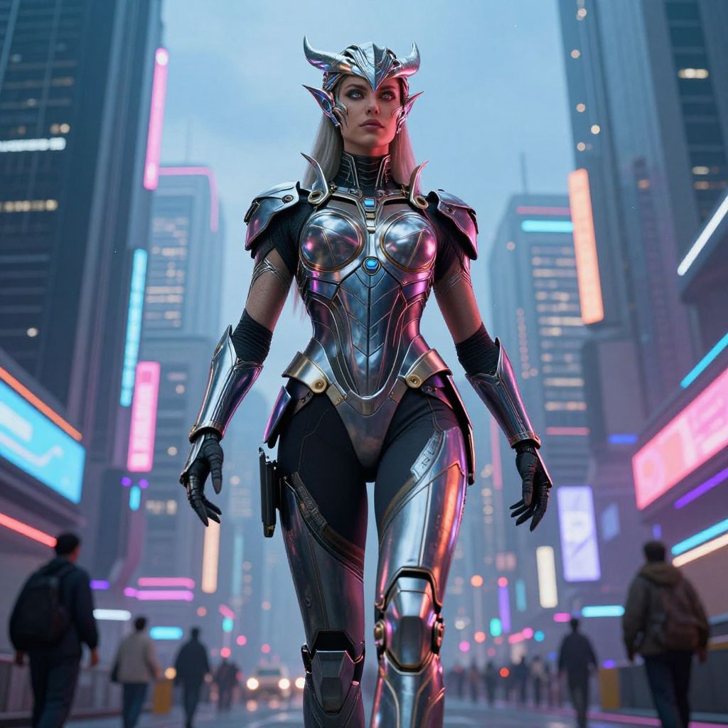 Amidst a fusion of ancient myth and futuristic technology, depict in meticulous detail a cybernetic demigod, their form an intriguing blend of organic flesh and sleek metal plating. From a 'bug's-eye view' perspective, an ethereal glow illuminates intricate patterns etched into their skin, resembling living tattoos pulsating with energy. Vibrant neon lights from nearby holographic displays dance upon their metallic armor, accentuating the contrast between the cold precision of technology and the warm essence of humanity within.