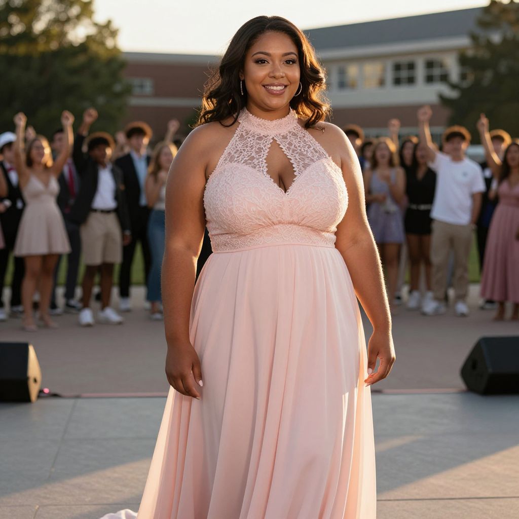 A confident plus-size woman with warm brown skin, expressive brown eyes, and a natural smile wearing a stunning homecoming dress plus size, flowing in soft pastel pink with a high neckline and elegant lace detailing, standing on a grand school courtyard stage at sunset, with students and cheering fans in the background, golden hour lighting creating soft shadows and highlights on her dress and face. The woman has big breasts and cute face