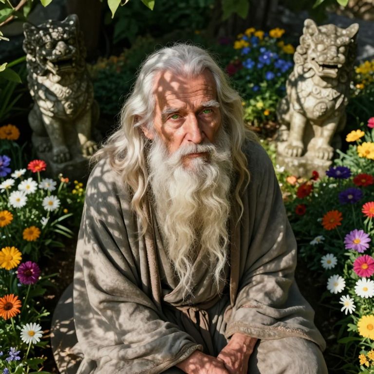 Imagine a photorealistic portrait of an aged yet wise sage, his long white beard flowing and his dreamy green eyes gazing peacefully. Captured from an aerial perspective, the sage sits in a tranquil garden, surrounded by a vibrant array of colorful flowers and ancient stone statues of mythical creatures. Sunlight filters through the leaves, casting intricate shadows on the sage's face and infusing the scene with a mystical air. The sage's expression is one of profound understanding, as if contemplating the enigmatic secrets hidden within the sculptures, blending nature, mythology, and introspection in a harmonious tableau. This moment evokes a deep sense of wonder, tranquility, and emotional connection to the world and its mysteries.
