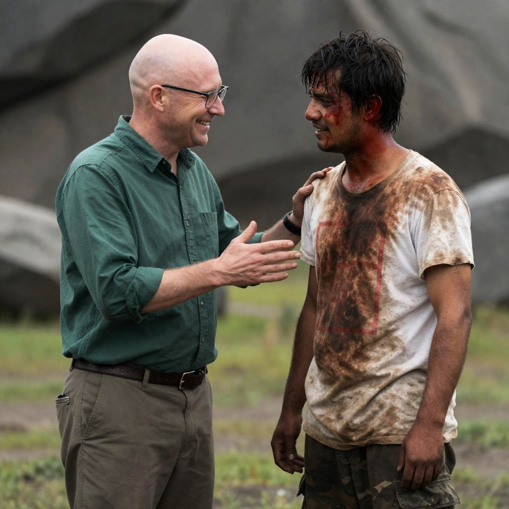 A bald, middle-aged man with a blood-stained, patterned shirt stands in a wooden, partially submerged area. His right hand is raised, and he has a fierce expression. Background: calm water with reflections. Multiple wooden poles surround him.