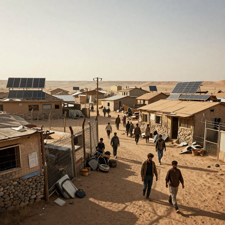 Photograph of a sunlit, desert settlement with sandy ground and small, beige, single-story houses. Several people, dressed in dark clothing, walk along a dirt path. Solar panels are installed on some roofs, and a chain-link fence surrounds a house on the left. Pots and bags are scattered on the ground, and shadows stretch long in the bright sunlight. The horizon shows a clear, blue sky meeting the sandy desert. The scene has a warm, late afternoon glow.