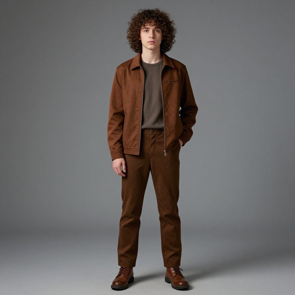"brown curly hair halloween, solo, pants, brown hair, hand in pocket, full body, long hair, standing, looking at viewer, shoes, grey background, male focus, curly hair, brown footwear, jacket, 1boy, closed mouth, long sleeves, shirt, simple background, brown jacket Realistic photo of casual sexy person with pretty face"