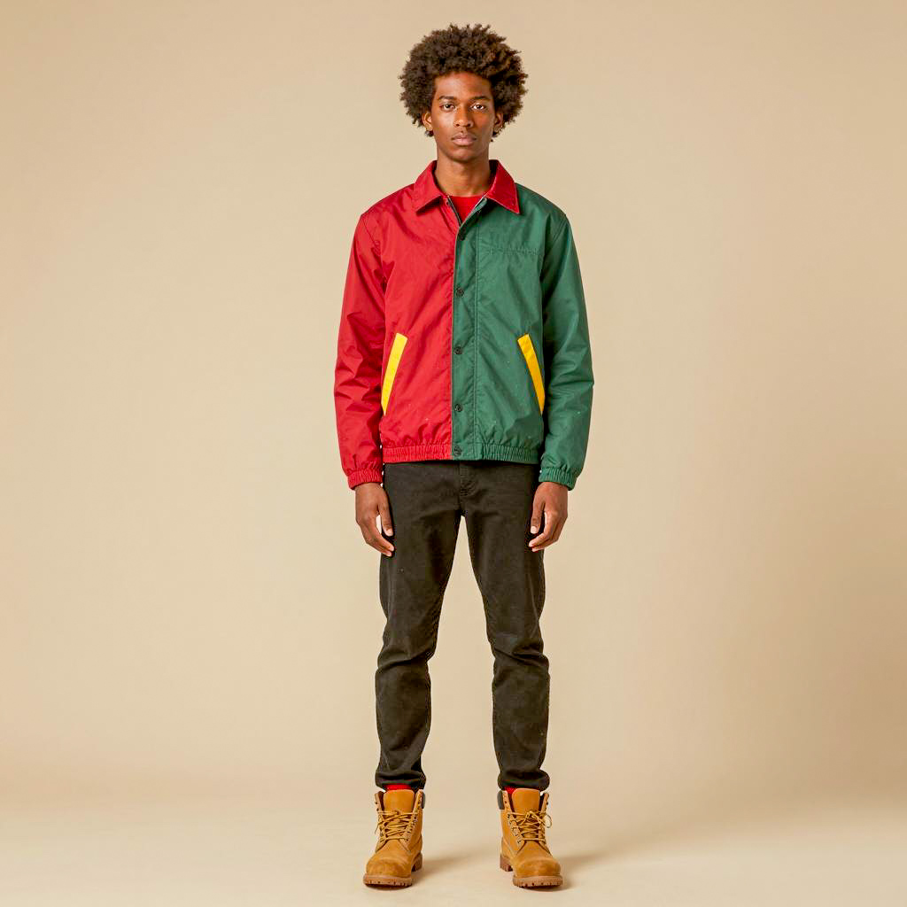 Full-body portrait of a young Black man with an afro hairstyle standing against a neutral beige background. He wears a red and green jacket with yellow accents, black pants, red socks, and brown boots. The studio setting and plain backdrop emphasize his casual, modern, slightly rugged urban fashion style. The subject has a tall and slender build and a serious expression, with neutral lighting and a centered composition.
