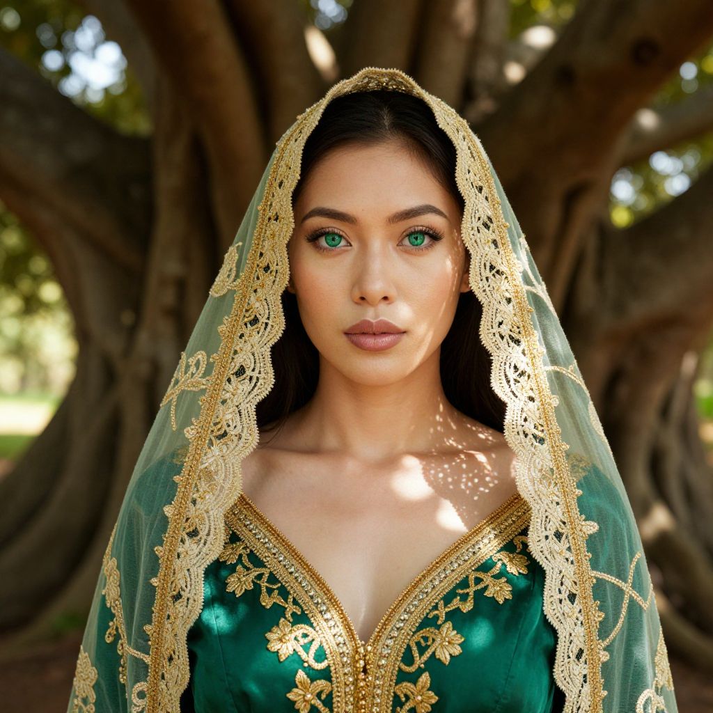 An ultra-realistic portrait captures a mysterious Micronesian woman with captivating green eyes and flawless alabaster skin, bathed in soft golden light filtering through an ancient banyan tree's canopy. Adorned in an emerald silk dress embellished with intricate gold embroidery that catches the light as she moves, her Central Asian heritage shines through. Her enigmatic expression—a blend of serenity and hidden depths—draws viewers into her story. From a unique insect's-eye perspective, we focus on her delicate lace-collared veil, revealing only her alluring gaze while casting dappled shadows across her porcelain skin, evoking timeless beauty and intrigue.