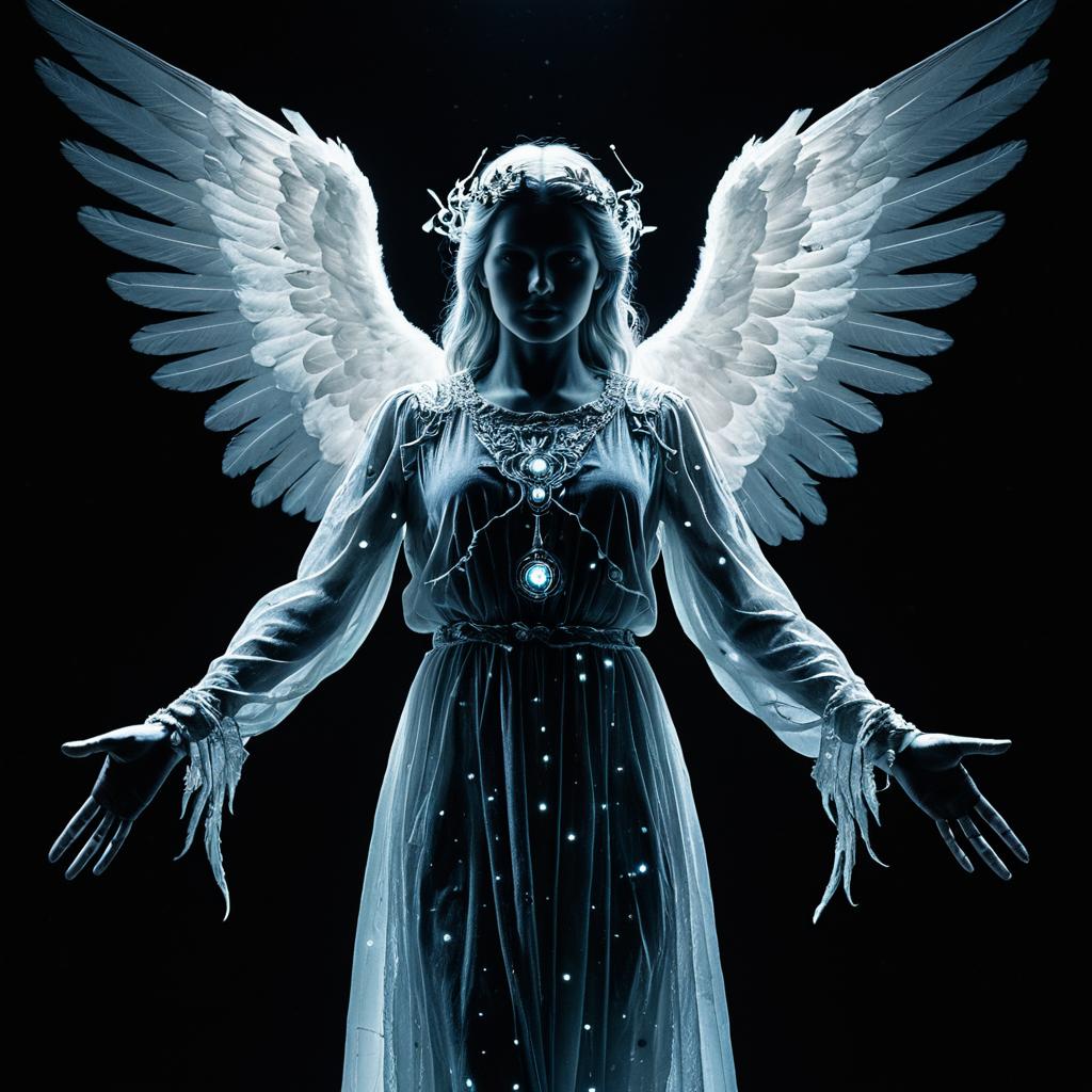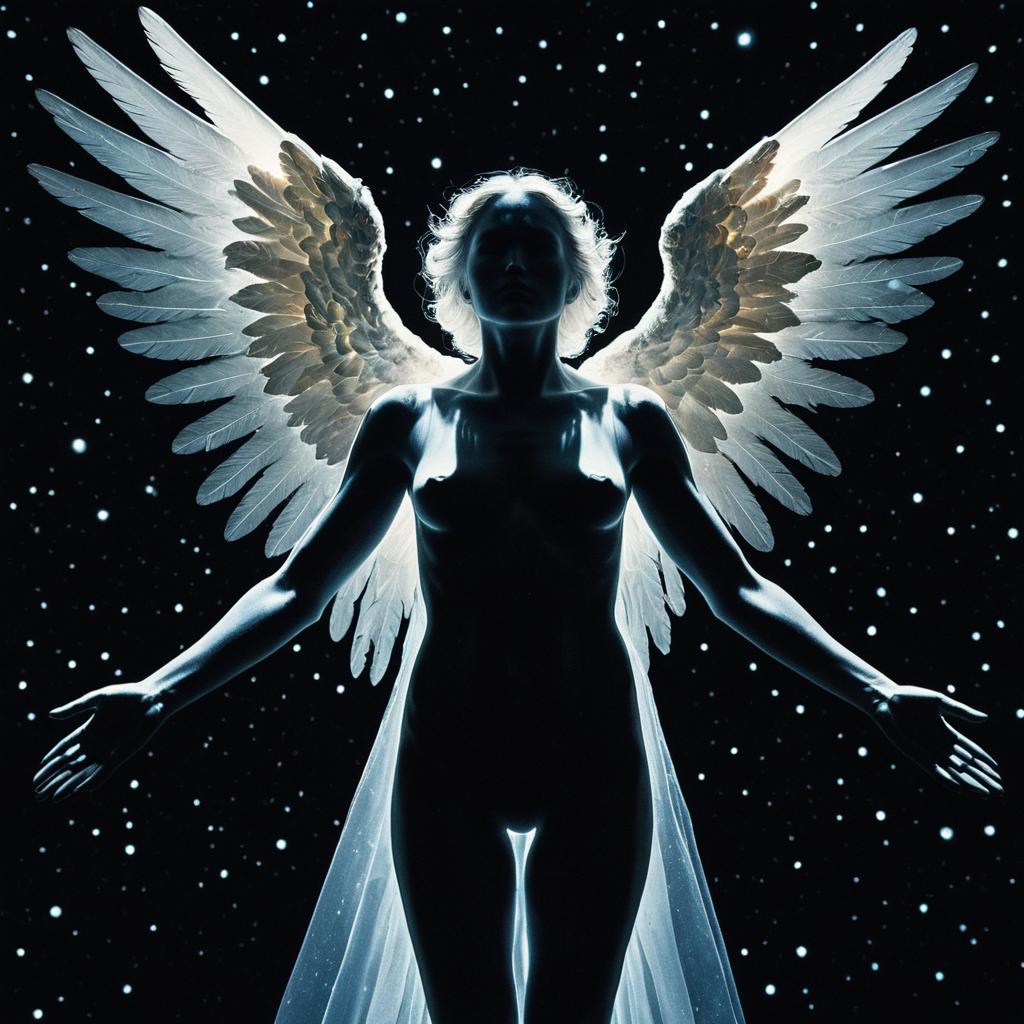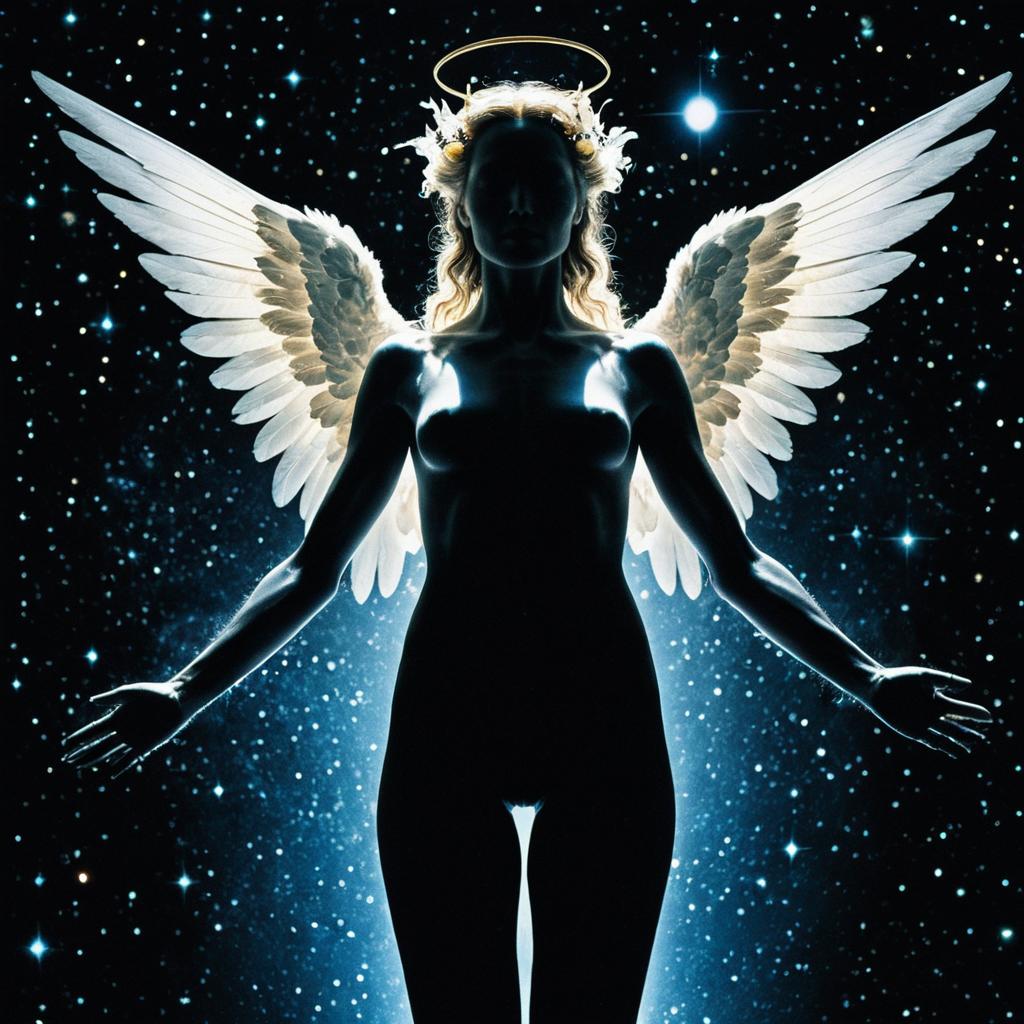 Hyperrealistic, expressionistic depiction of a shadowed female angelic figure with glowing white wings and a celestial halo, set against a star-filled cosmic background. The figure's body is translucent and merges with cosmic elements, creating a dreamlike and transcendental atmosphere.