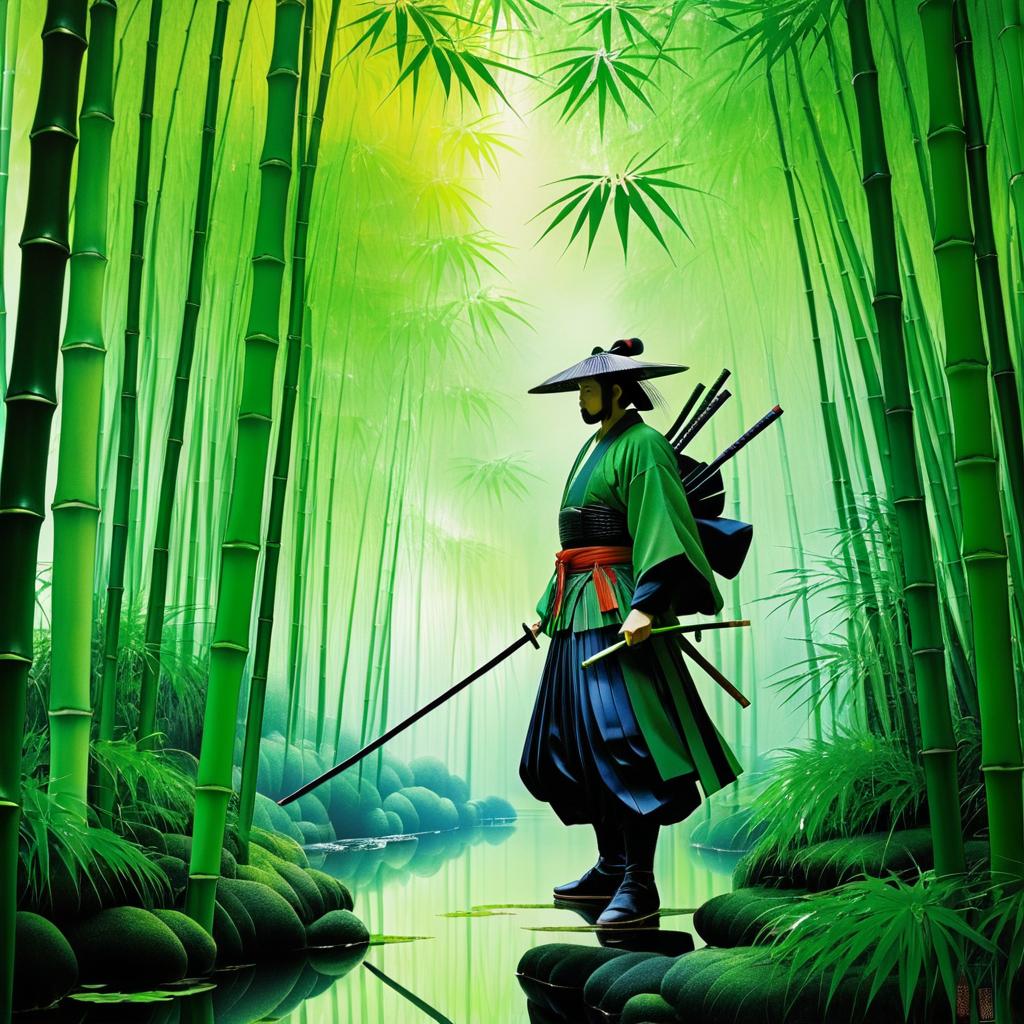 A detailed and dramatic illustration of a samurai standing in a serene bamboo forest. The samurai wears traditional black robes and a wide-brimmed hat, holding a sheathed katana. The lush green bamboo stalks and soft light create a tranquil atmosphere, inspired by the art style of Yoshitaka Amano.