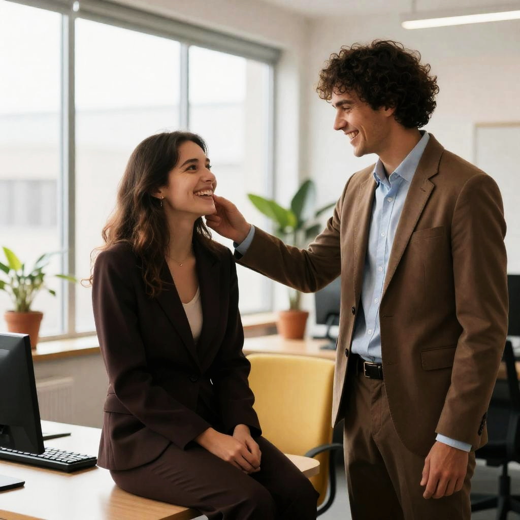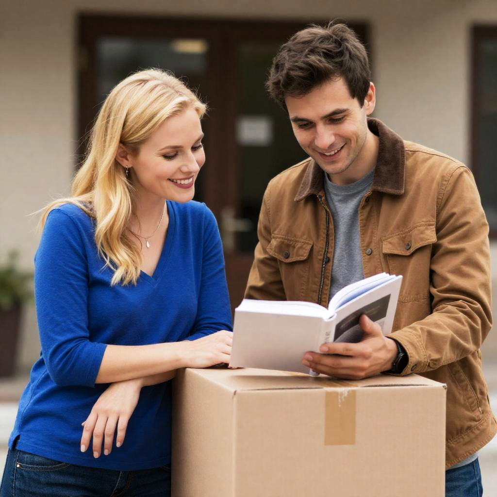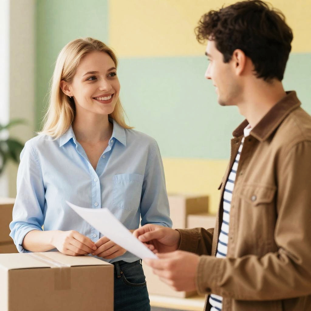 Photograph of two people. Blonde woman with light blue shirt, smiling, facing man with dark brown hair, brown jacket, and striped shirt. Man holding white paper, looking at her. Cardboard box on table. Background: blurred green and yellow. Both smiling.