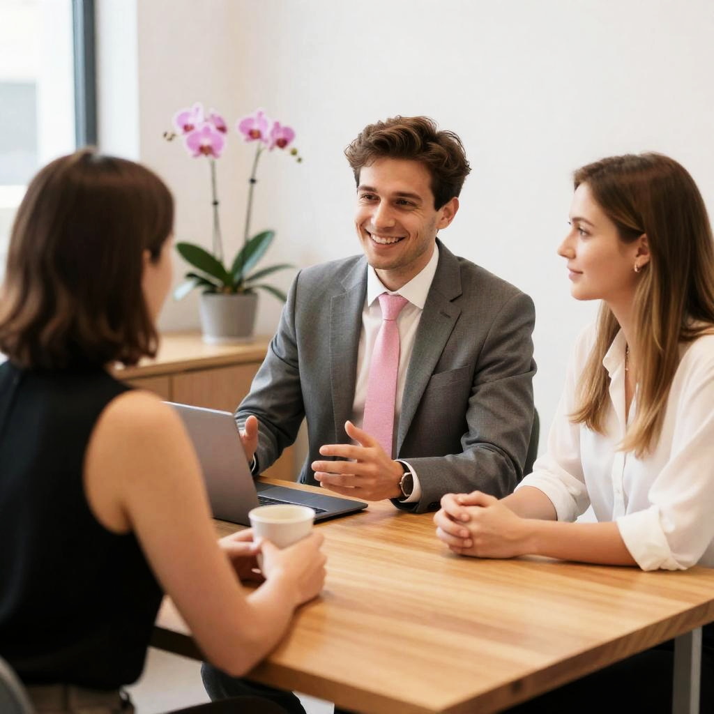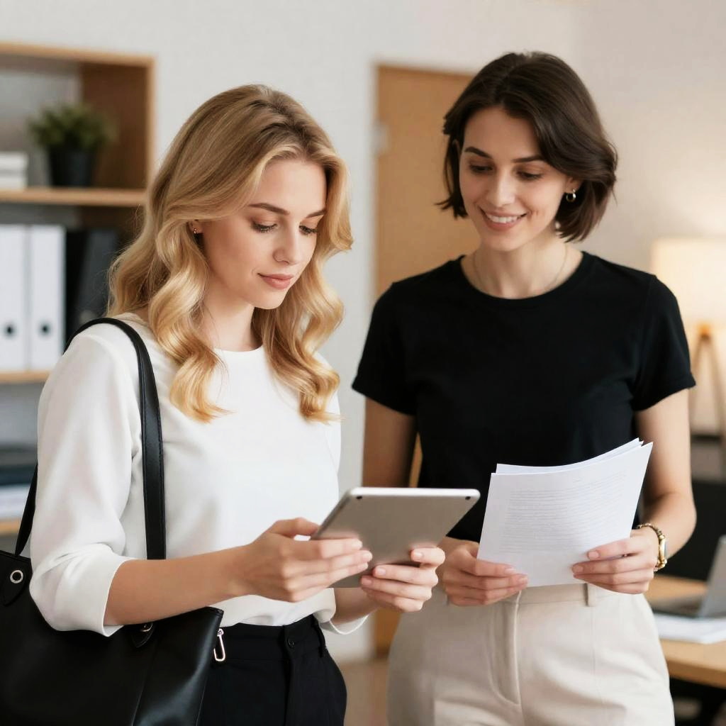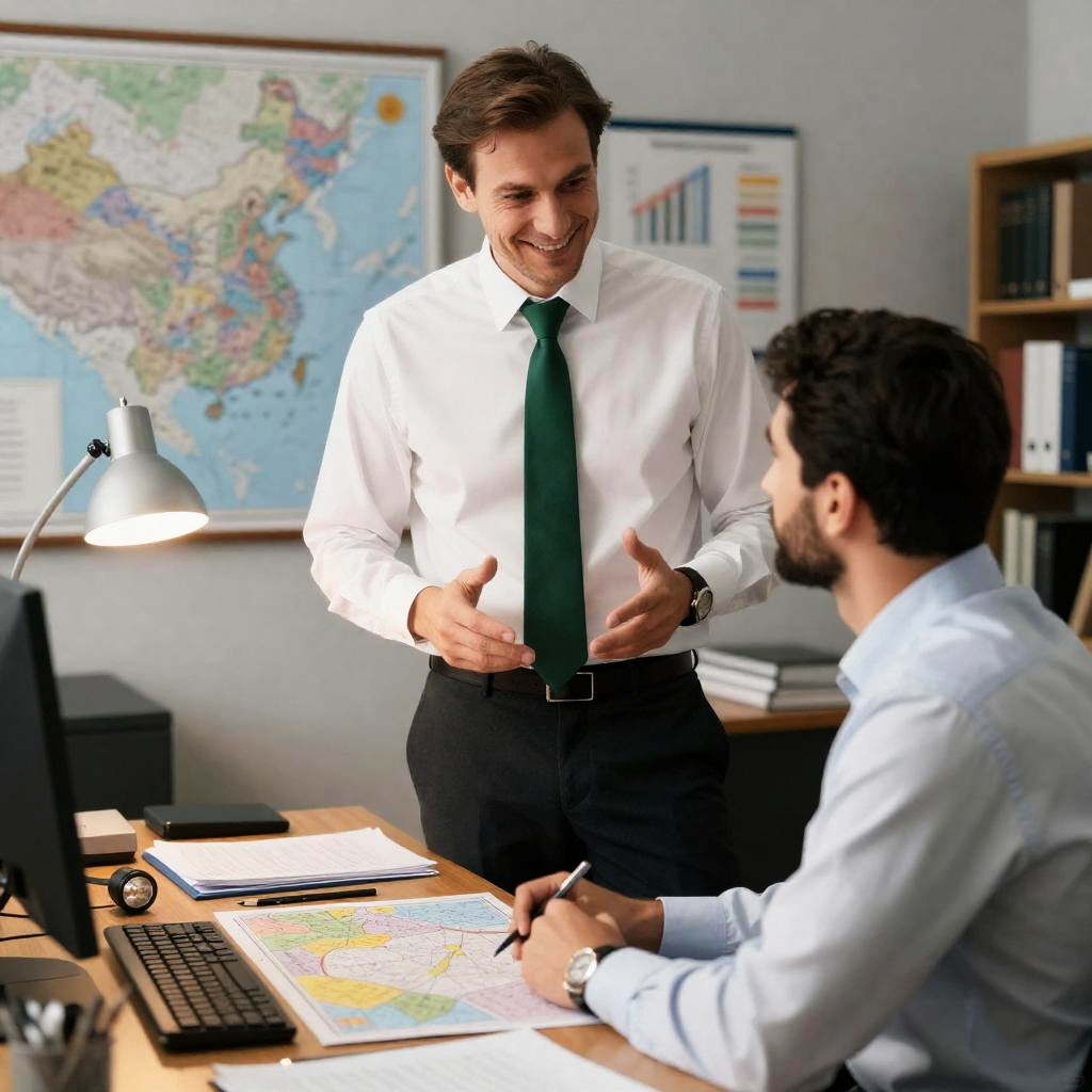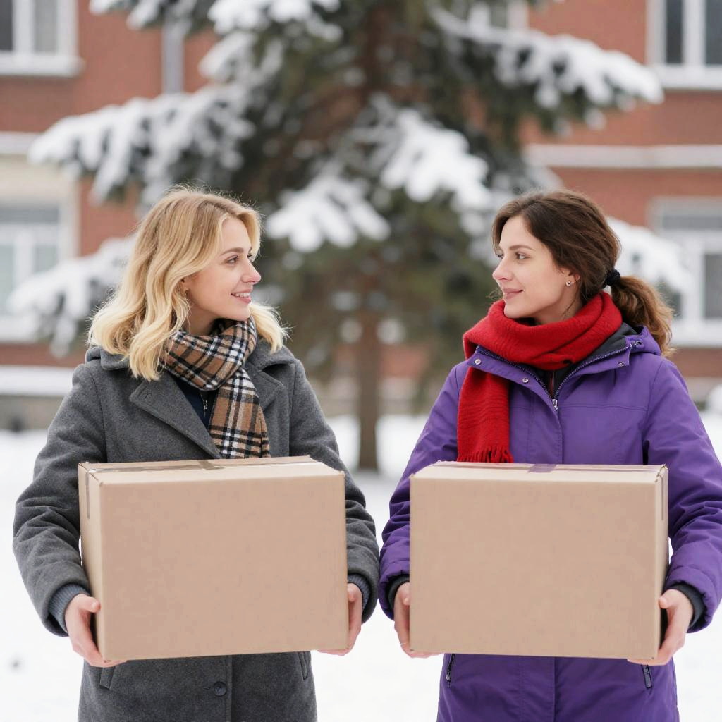 Photograph of two people. Blonde woman with light blue shirt, smiling, facing man with dark brown hair, brown jacket, and striped shirt. Man holding white paper, looking at her. Cardboard box on table. Background: blurred green and yellow. Both smiling.