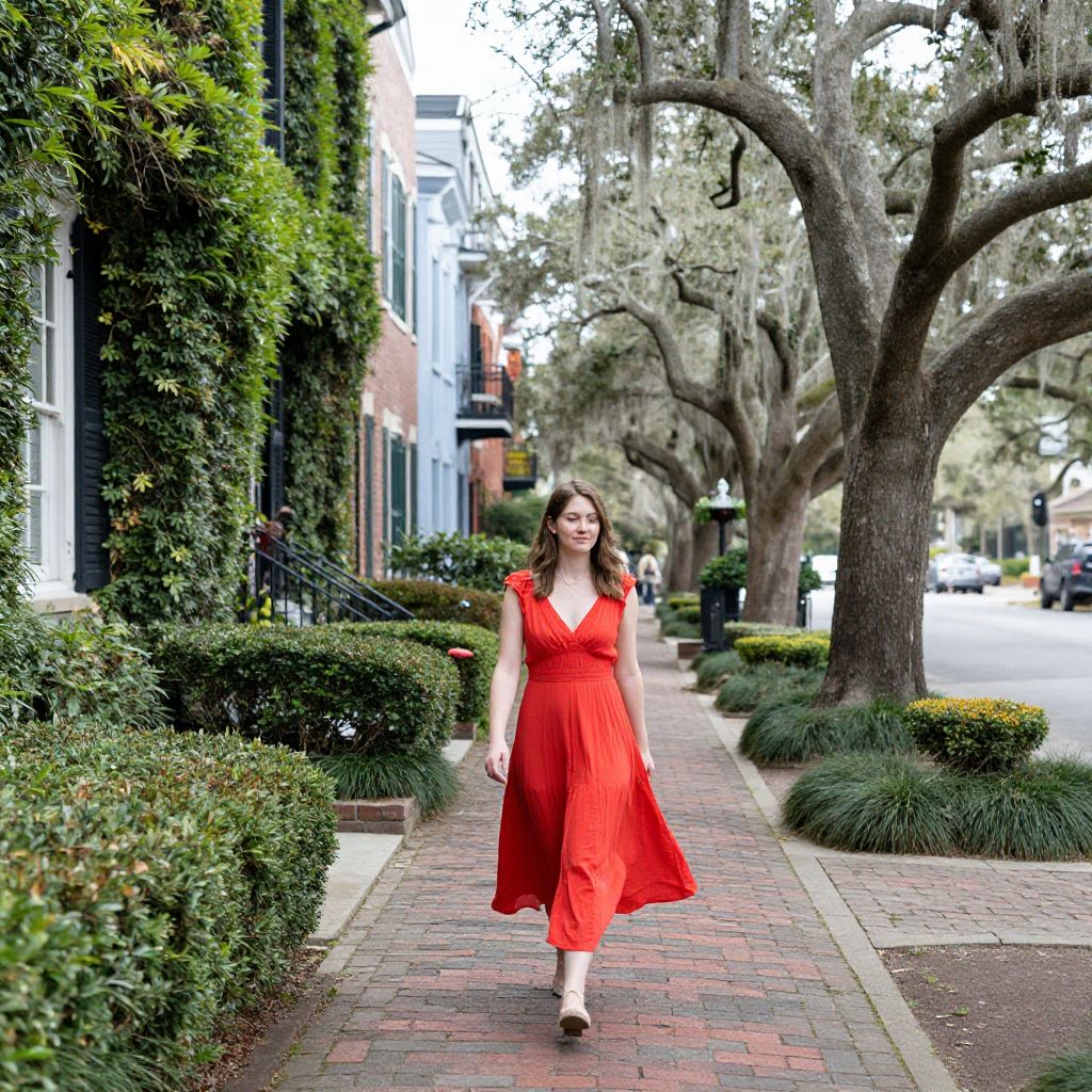 Woman strolling gracefully along a picturesque brick sidewalk in Savannah, her vibrant red dress flowing as she walks between historic homes draped in lush ivy on one side and neatly trimmed boxwood shrubs and towering trees on the other.