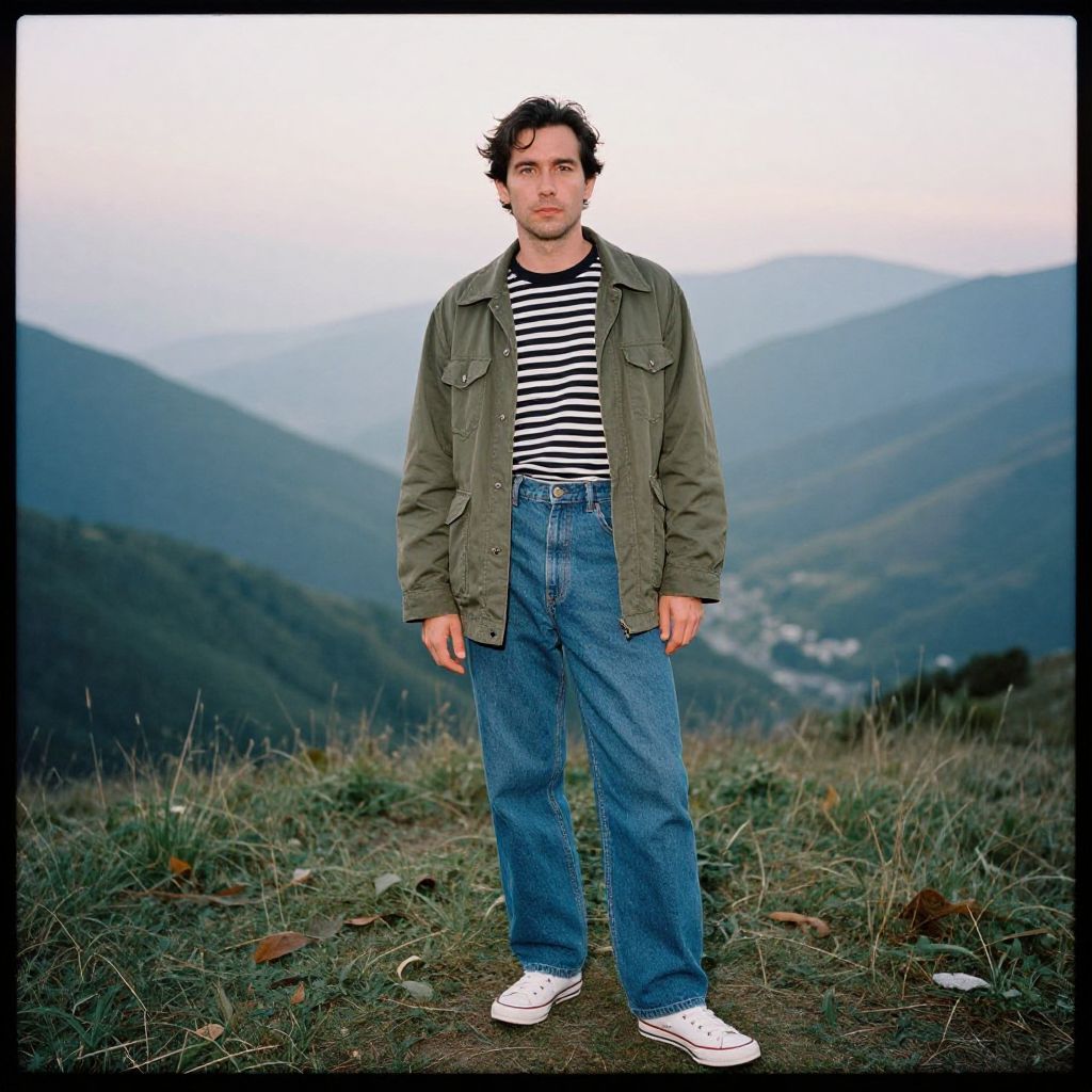 A man, stylish fishing waders in camo print, thermal socks in navy blue, breathable cotton t-shirt in light gray, packable rain jacket in bright orange, rugged lace-up boots in tan, hidden cove surrounded by towering pine trees, sun-dappled shore, driftwood scattered along the sand, polaroid instant camera style, relaxed expression, enjoying nature. Man has masculine face and piercing eyes