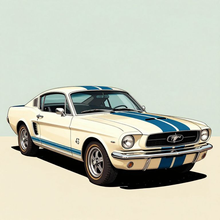 Digital illustration of a classic white Ford Mustang with two blue racing stripes, chrome accents, and black shadow, set against a white background.