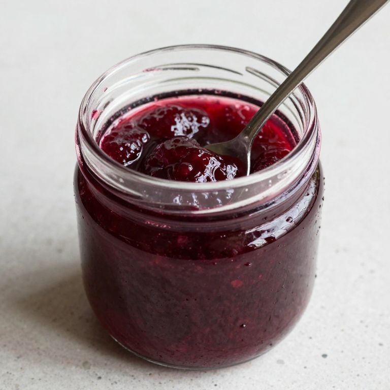 Glistening homemade raspberry jam sits in a clear glass jar, its deep red hue contrasting against the speckled countertop, with a stainless steel spoon resting inside, ready for tasting.