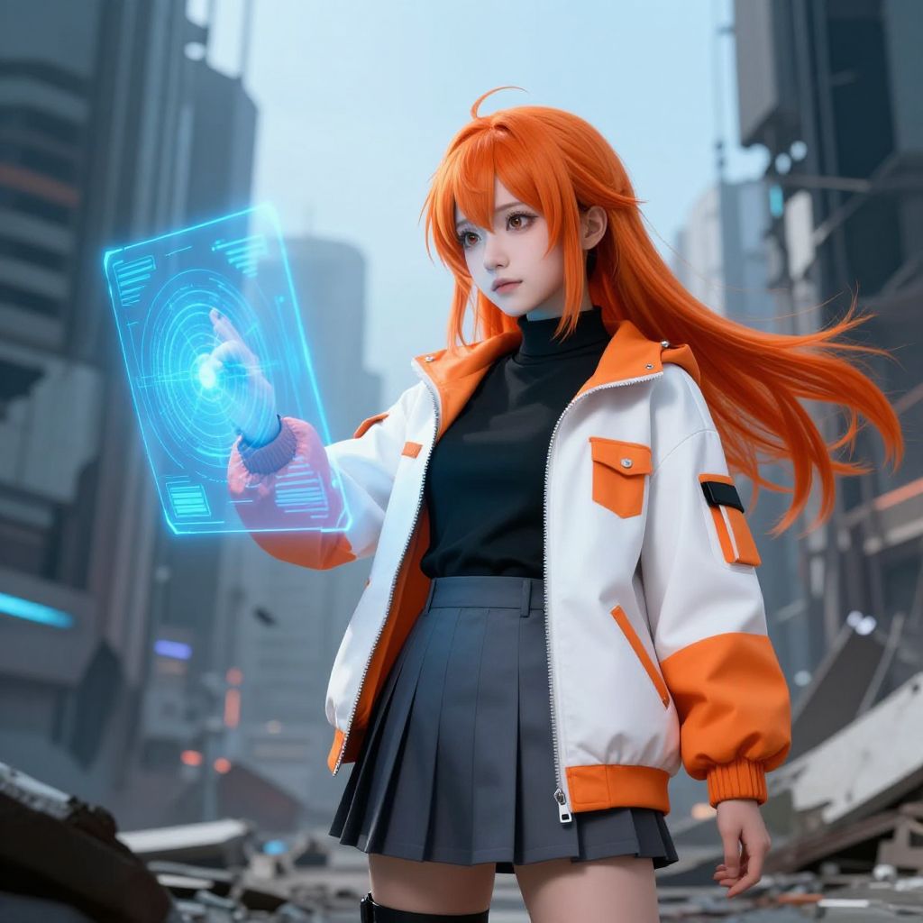 Digital artwork of a futuristic anime-style girl with vivid orange hair, wearing a white and orange jacket over a black high-neck shirt and a grey skirt. She is interacting with a blue holographic screen, set against a backdrop of a dystopian cityscape with towering, partially ruined buildings.