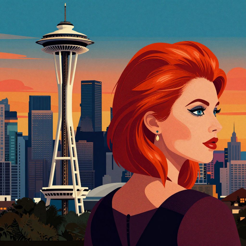 Digital illustration of a red-haired woman with bold makeup, earrings, and black top, gazing at Seattle's skyline with the Space Needle at sunset.