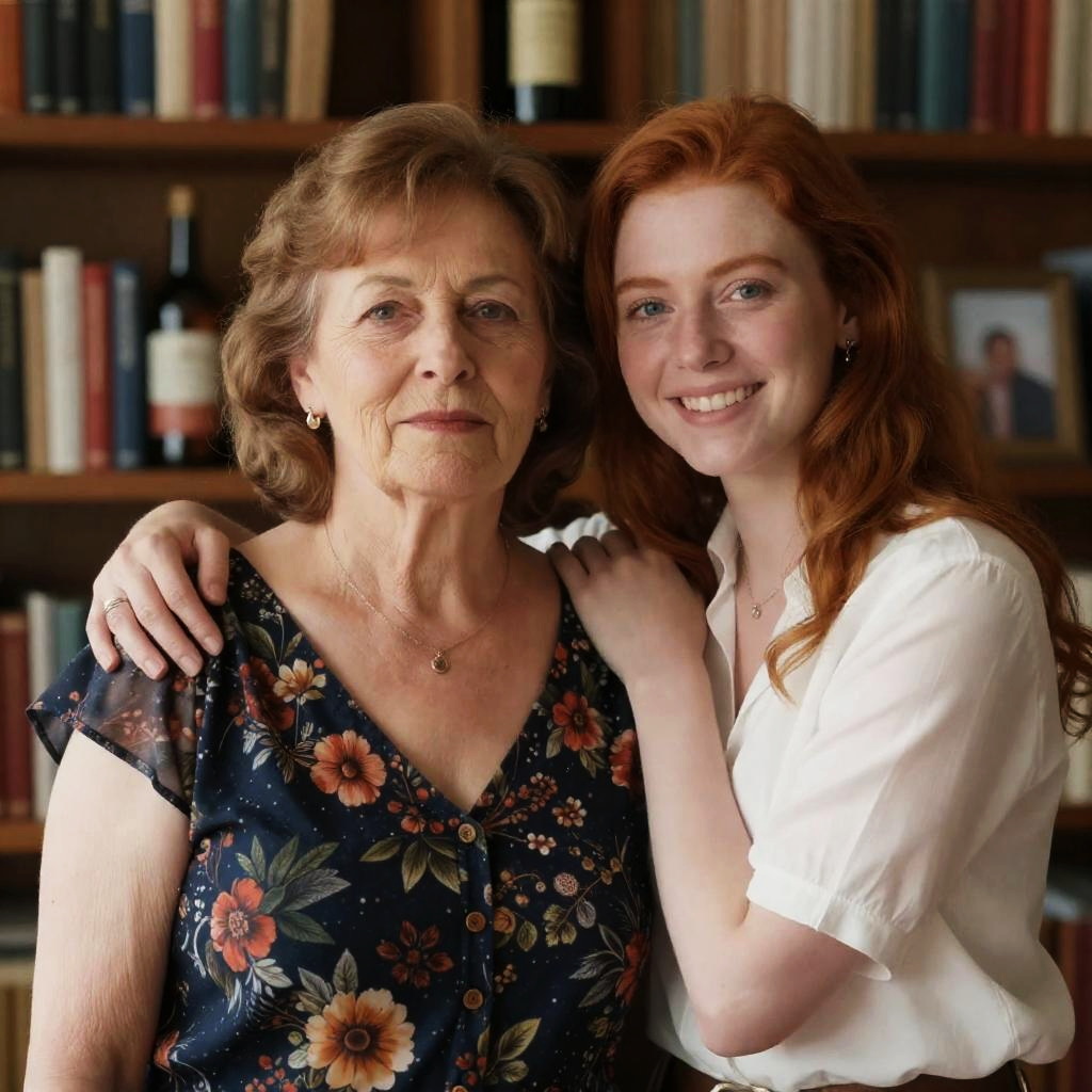 Photograph of two people dancing at night. Both wear silver masks with blue and pink detailing. Young woman in light blue, sleeveless dress with white sheer sleeves, blonde hair in curls. Older woman in silver sequined jacket, pink hair. Holding hands, standing in front of stone steps with string lights in background. Both have neutral expressions.