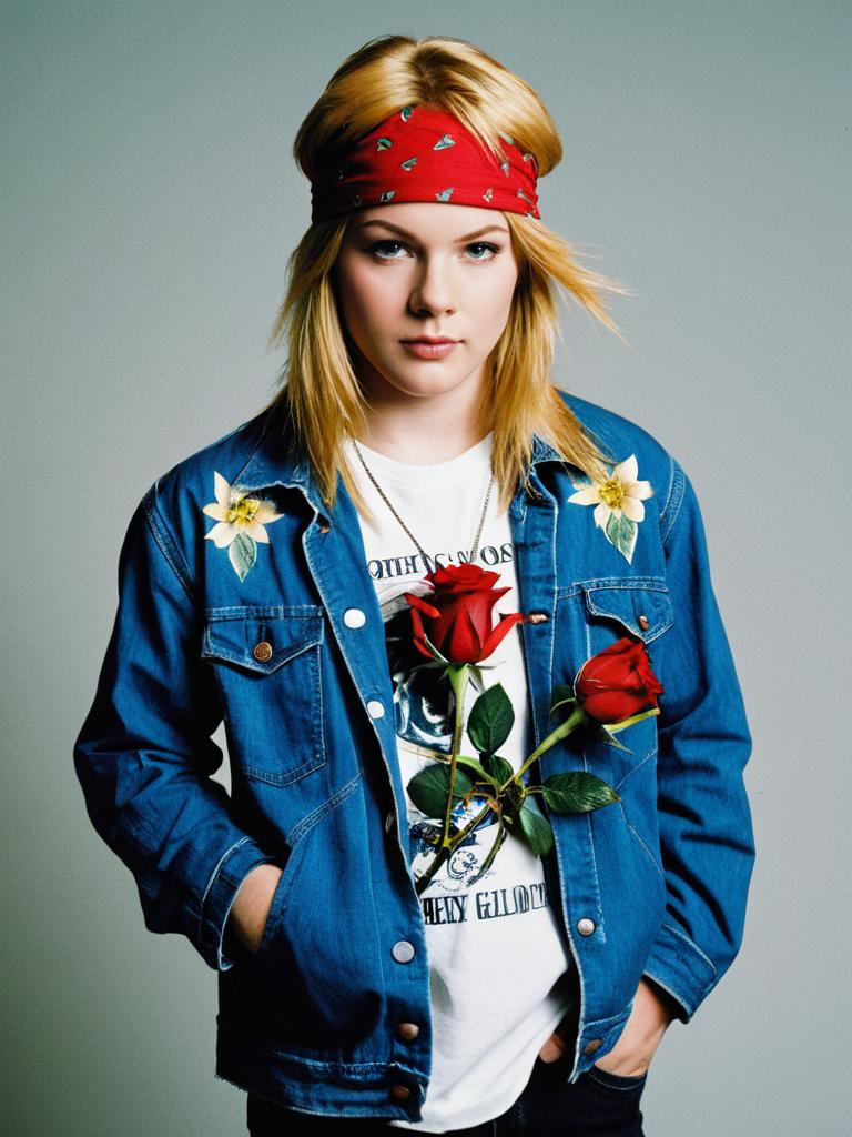 Portrait of a young blonde man with blue eyes wearing a red bandana, blue denim jacket with floral patches, and a white graphic t-shirt. He holds two red roses and looks directly at the camera with hands in the jacket pockets. The outfit is inspired by Axl Rose's style.