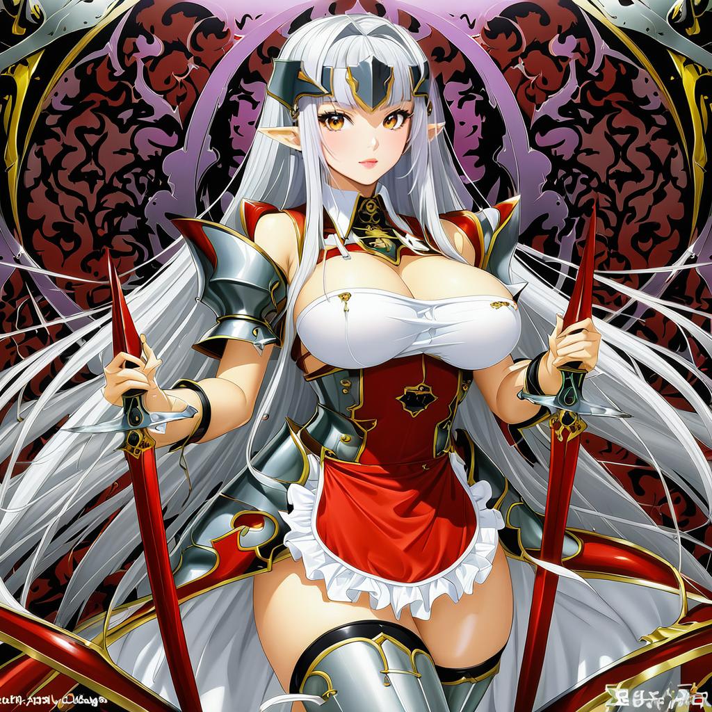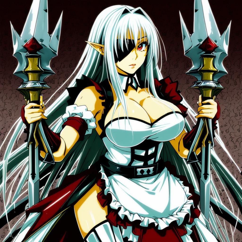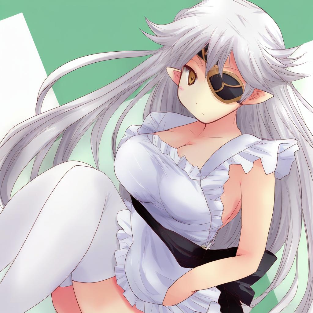 Aldra (queen's blade), queen's blade, 1girl, pointy ears, red eyes, eyepatch, long hair, silver hair, large breasts, apron, thighhighs, by artist zinno, illustrious