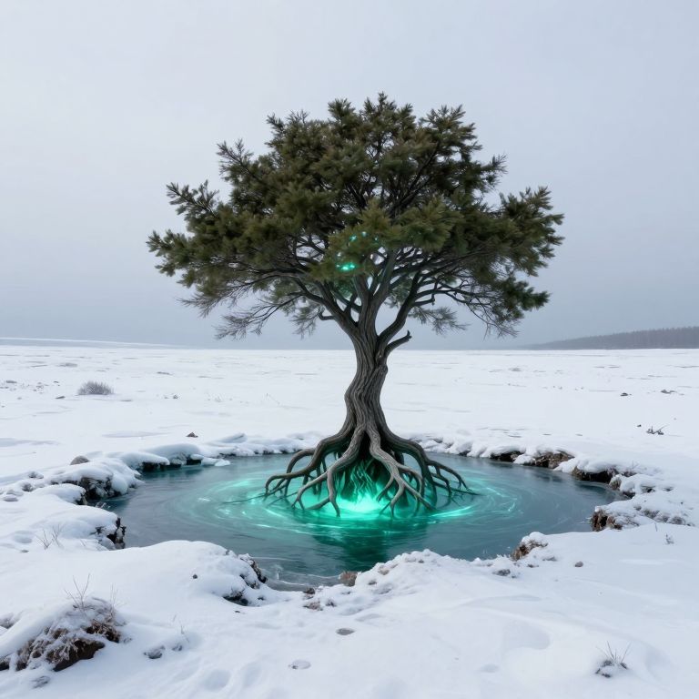 A surreal digital artwork depicts a snowy tundra landscape where a solitary tree stands with its roots exposed above ground, cradling a glowing lake below, while its canopy is buried beneath frozen soil, creating a mesmerizing contrast between the ethereal green glow and the stark white snow.
