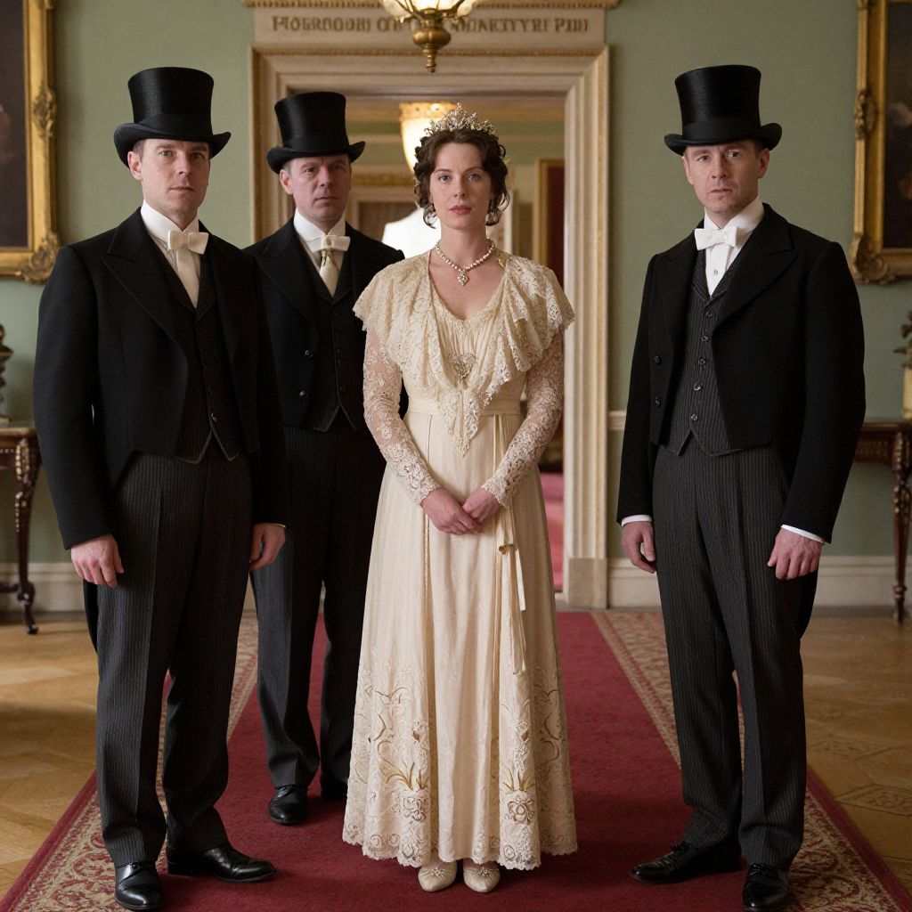 Elegantly dressed characters from *Downton Abbey*, Season 6 (1925), stand in a grand hallway, with a woman in a cream lace dress positioned centrally, flanked by two men in formal black suits and top hats, reflecting the period's sophisticated attire designed by Anna Mary Scott Robbins.