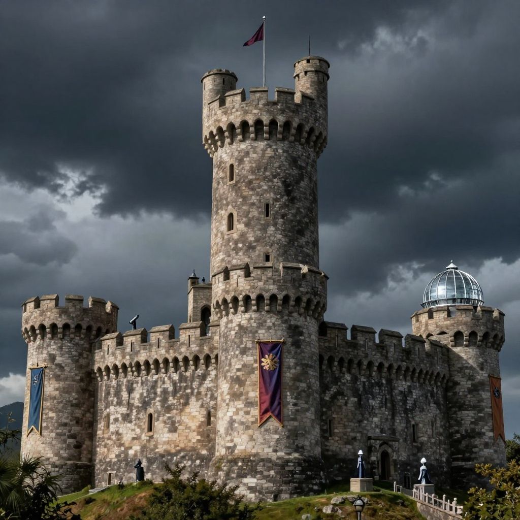 Score_9, score_8_up, score_7_up, masterpeice, establishing shot, A wizard tower on a hill, arcane tower, with a motte and bailey, realistic fortification, realistic curtain walls, banners, penants in the wind, dark stormy night, several guards on the walls, observatory telescope, glass domed structure