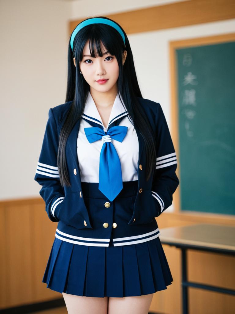 Photo-realistic cosplay photo of person standing in morishima haruka costume. 1girl, blue eyes, long hair, black hair, hairband, large breasts, kibito high school uniform, kibito high school uniformfull body shot. lifestyle stock photo, shallow depth of field, lifestyle stock photography, shallow depth of field, natural lighting, warm tones, soft background blur, vibrant colors, realistic textures