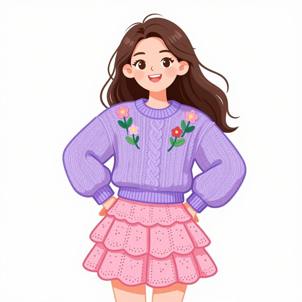 Woman with pretty face and pretty hair. smiling Woman, playful romantic, lavender cable-knit sweater with embroidered floral accents in pink and green, oversized balloon sleeves, ribbed cuff, pink tiered mini skirt with eyelet lace detailing, scalloped hem, white background --sref 1467