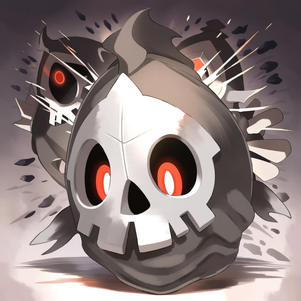 Digital illustration of Duskull, a ghost-type Pokemon character, featuring its distinctive skull mask and glowing red eyes. The design emphasizes a ghostly and eerie atmosphere with dark, swirling background elements and dynamic lighting effects, highlighting the character's supernatural theme.