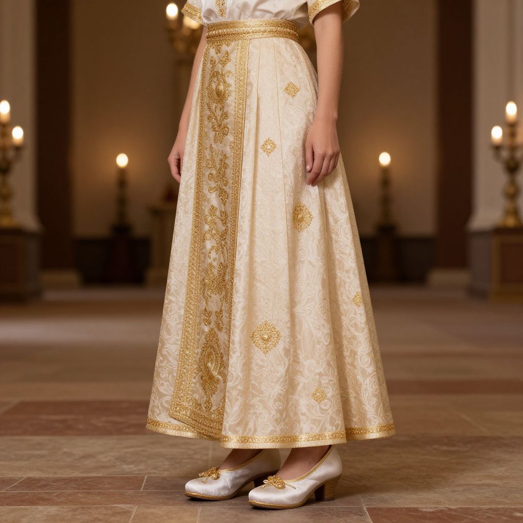 Photograph of a person wearing an ornate, cream and gold embroidered skirt and white satin shoes, standing in a dimly lit, elegant room with