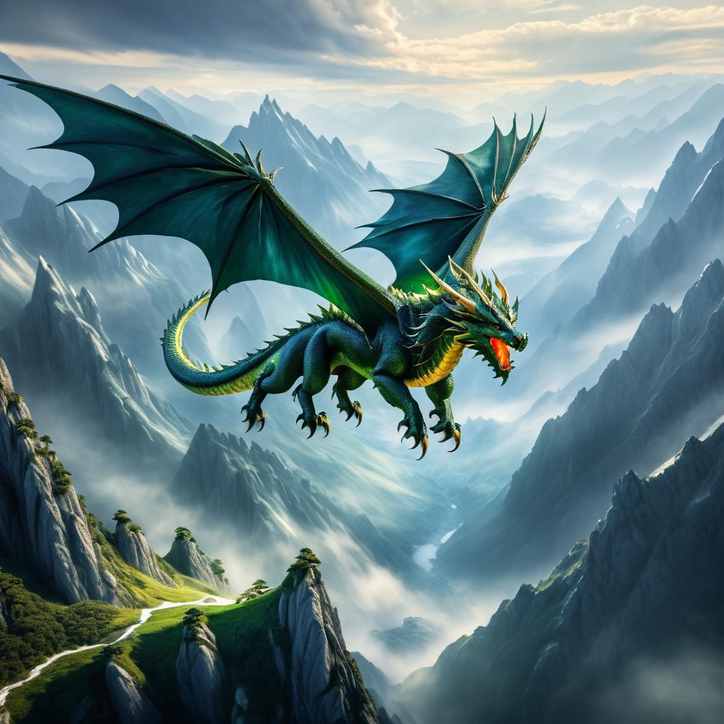 Green Dragon Flying Over Mountain Valley