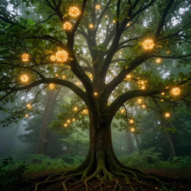 Majestic tree stands rooted firmly in a misty forest, its sprawling branches adorned with luminous, glowing orbs that resemble blooming flowers, casting a warm, ethereal light over the verdant surroundings.