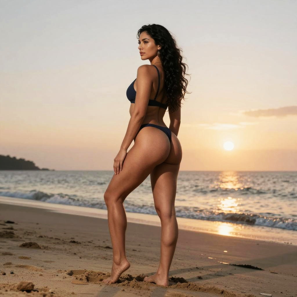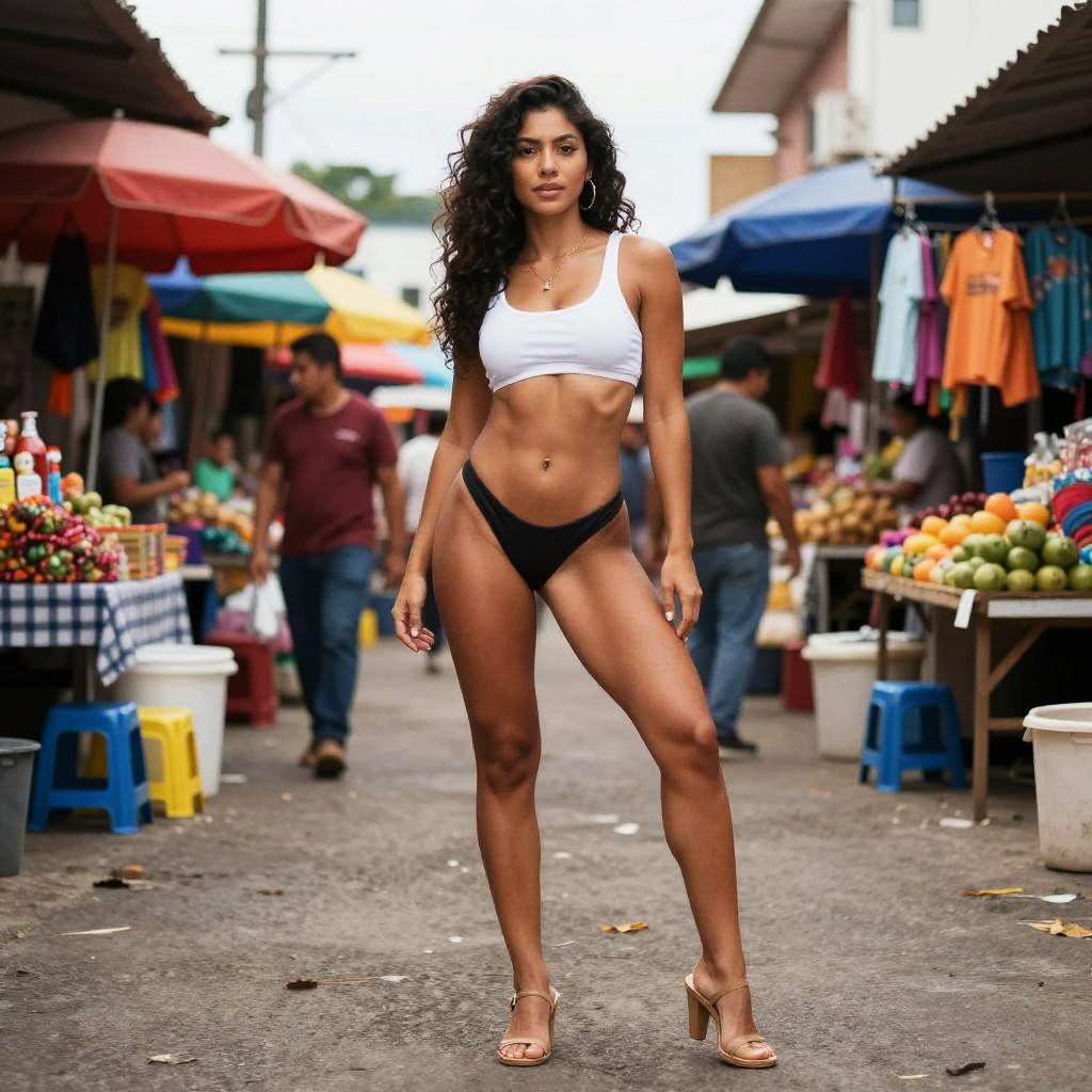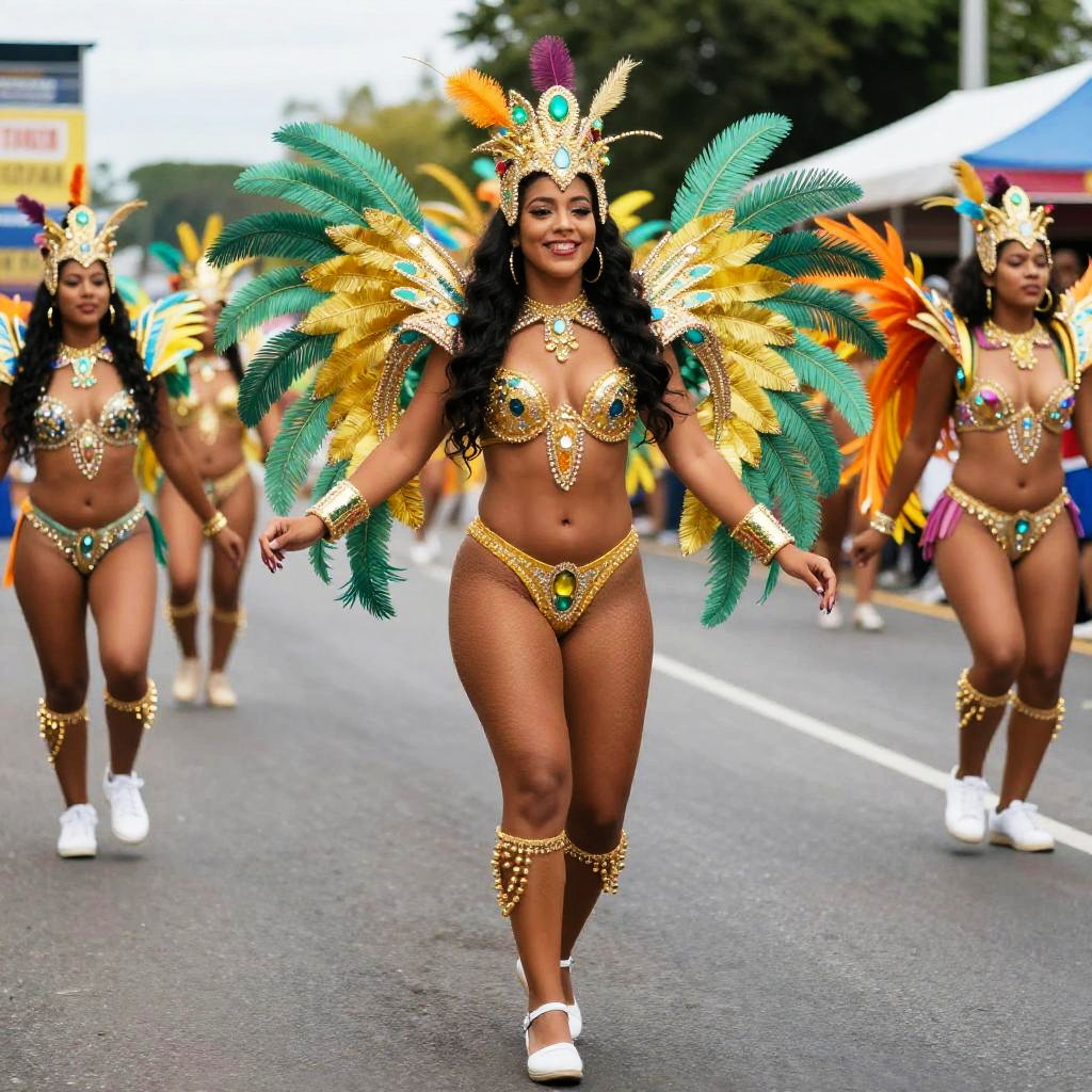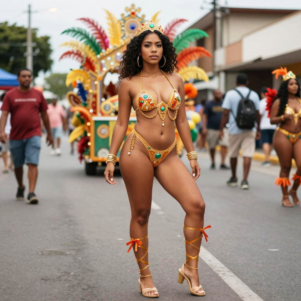 Full-body shot of a woman with a Latin physique, against a colorful carnival parade with dancers and floats.