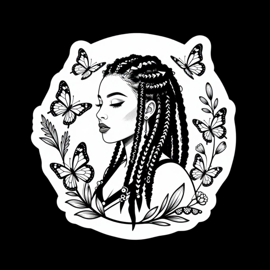 Black and white digital drawing of a woman with braided hair, surrounded by butterflies, set against a white circular background.