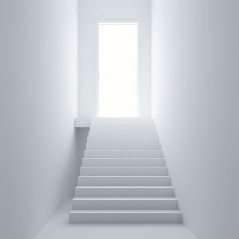 A minimalist staircase ascends into a luminous void, defying gravity as it leads toward a door bathed in ethereal light, inviting passage into an otherworldly realm.
