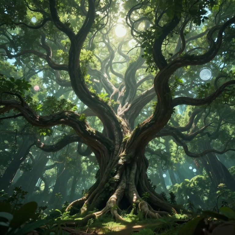Photorealistic digital art of a massive, ancient tree with twisting branches, bathed in sunlight filtering through dense, green forest canopy.