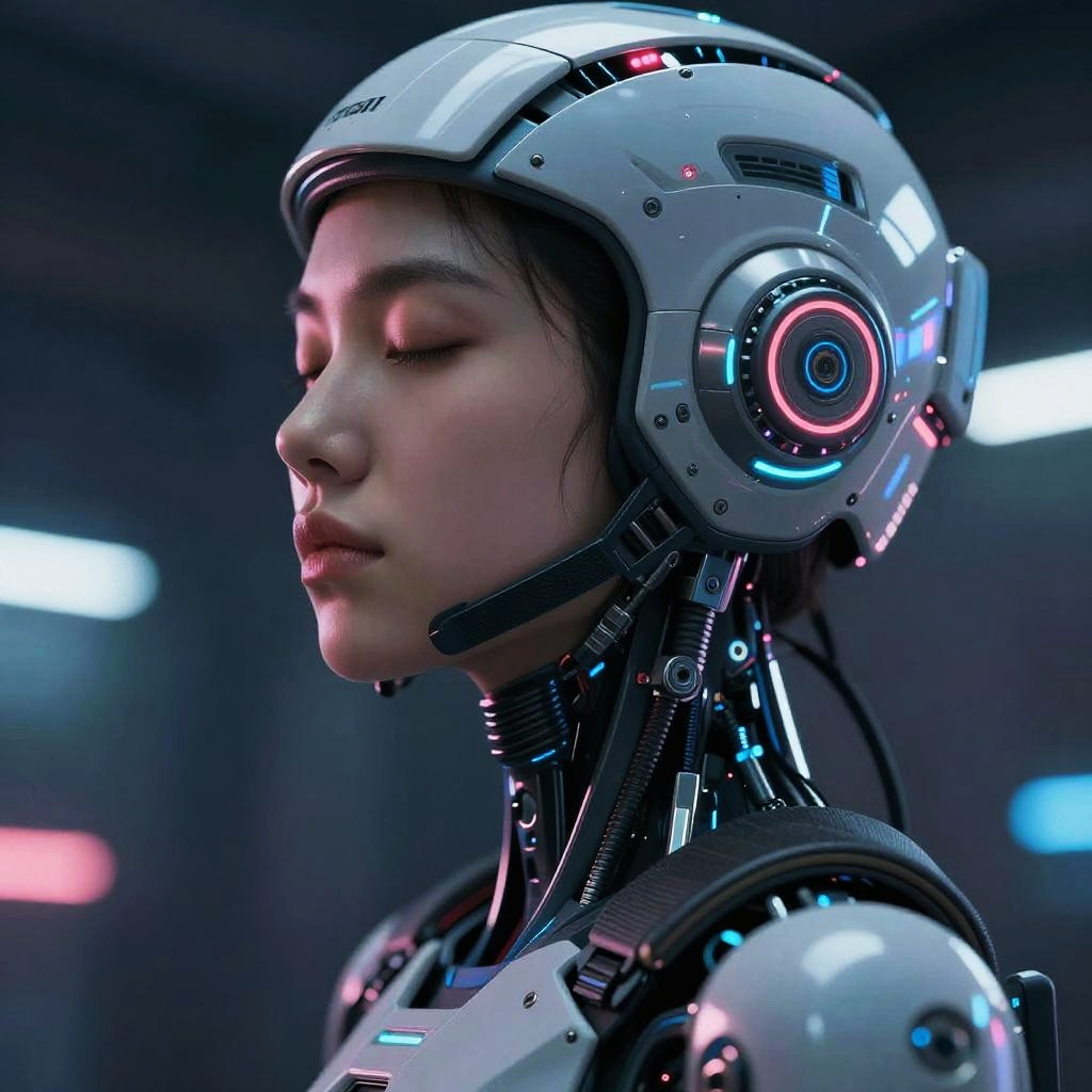 Side profile of a realistic cyberpunk female cyborg with Asian features, closed eyes, and a sleek futuristic helmet adorned with neon lights. The upper body is detailed with mechanical and robotic components, showcasing advanced science fiction technology in a dimly lit environment with neon accents.