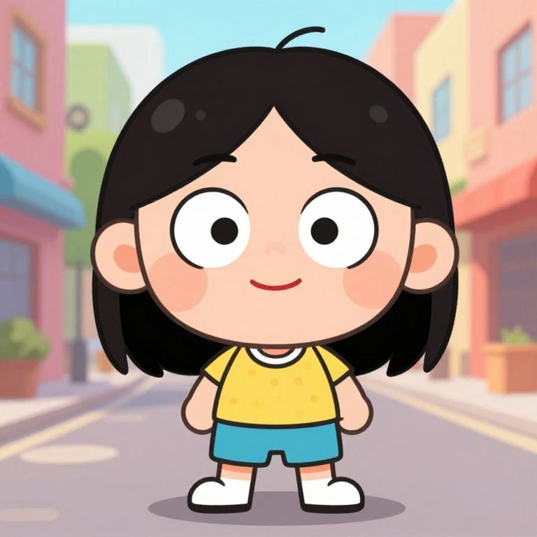 This is a colorful digital cartoon drawing of a young girl with large, round, black eyes and a small, smiling mouth. She has straight, black hair that falls to her shoulders and is wearing a yellow shirt with blue shorts and white shoes. The background is a blurred, pastel-colored street scene with pink buildings, green plants, and blue awnings, suggesting a sunny day in a small town. The girl stands in the center, with her arms slightly out to her sides, giving a friendly and approachable appearance. The style is reminiscent of modern, simplistic, and cute anime or children's book illustrations.