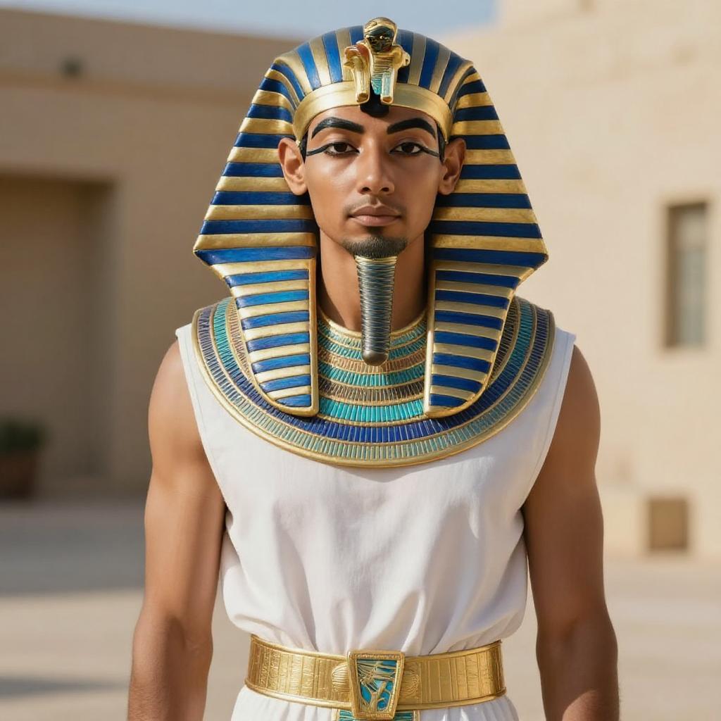 Portrait of a young man wearing a realistic ancient Egyptian Pharaoh costume, featuring a striped blue and gold nemes headdress, matching collar, and a gold belt. He is dressed in a white sleeveless tunic with gold and blue accents, has a neatly trimmed beard, and a serious expression. The background is softly blurred with warm sunlight, suggesting an outdoor setting.