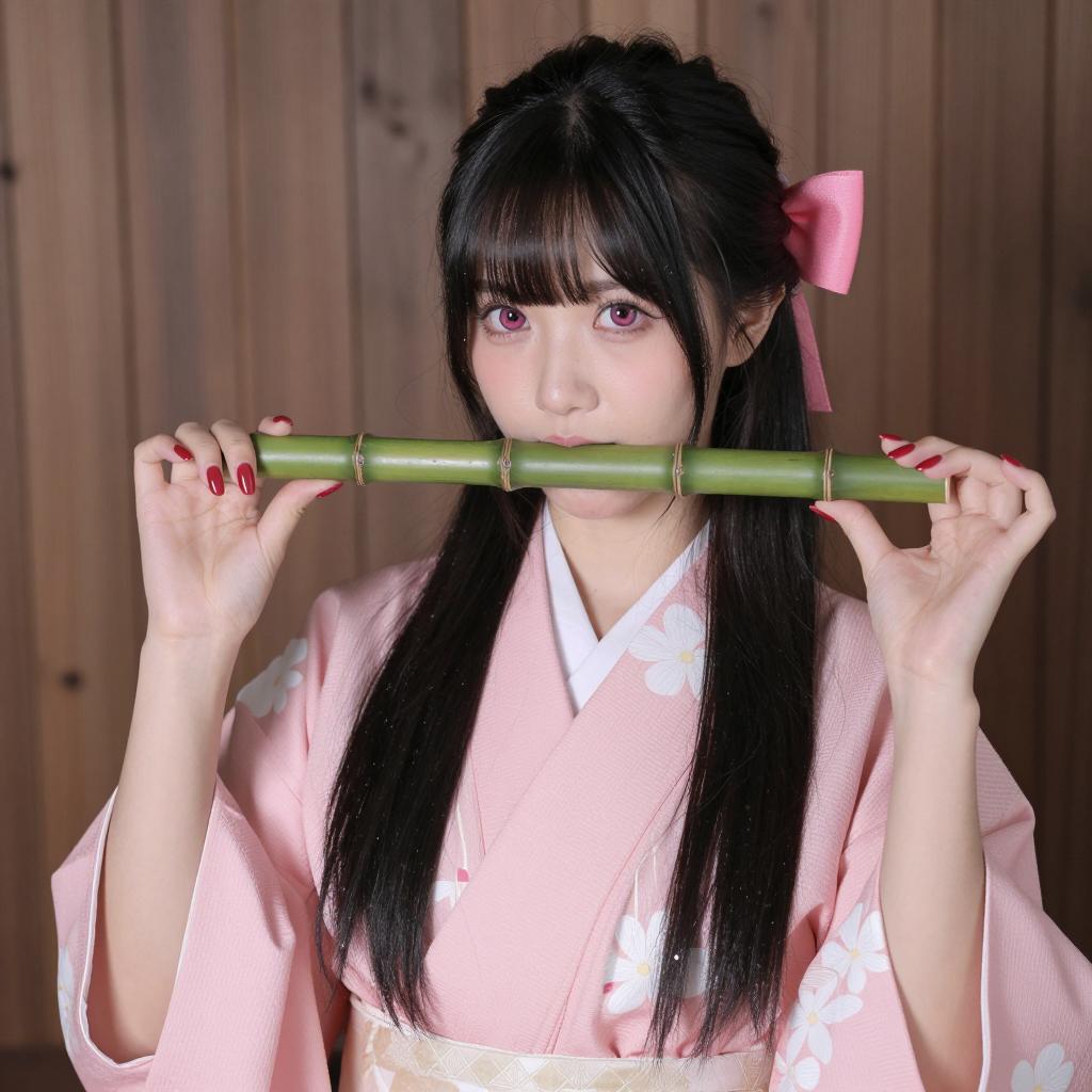 Asian woman with long black hair and pink eyes, wearing a pink kimono with white pattern, holding a green bamboo stick in her mouth. Pink bow in hair, red nails, brown jacket, wooden background. Both hands grip bamboo stick.