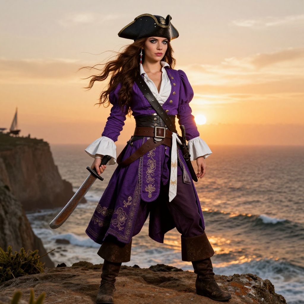 A vibrant female pirate girl with long, flowing brown hair that cascades over her shoulders, her eyes sparkling with mischief and courage. She wears a bold purple pirate outfit with elegant white accents, including a fitted white collar that ties at the neck, white gloves, and a wide, embroidered pirate skirt. Her boots are sturdy and slightly weathered, and she holds a rusted but shiny cutlass in one hand, standing on a sun-drenched coastal cliff at sunset, the horizon glowing with golden-orange hues. The atmosphere is adventurous and alive, with waves crashing below and a hint of sailboats in the distance, capturing the spirit of a fearless sea-born heroine.